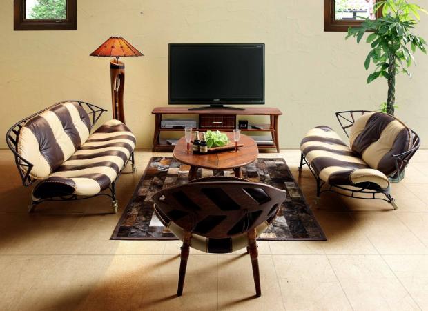 - Мебель без выраженного современного оттенка. Углы мебели сглаженные, поверхность чаще всего делается из кожи. В качестве акцента с африканским принтом могут быть декоративные подушки или отдельные части мебели – спинка, подлокотники.