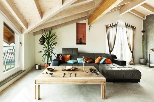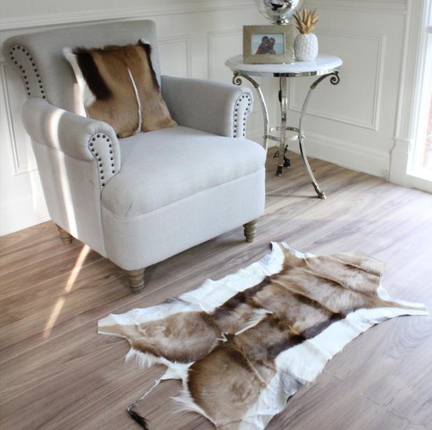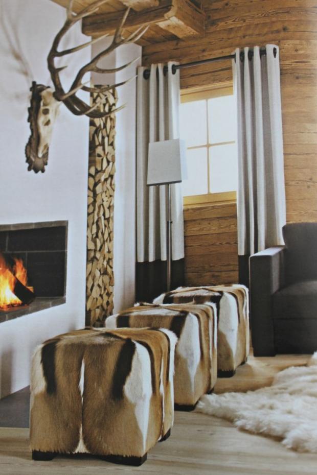 - Поставьте невысокий деревянный стол возле диванной зоны, а на пол постелите шкуру животного.