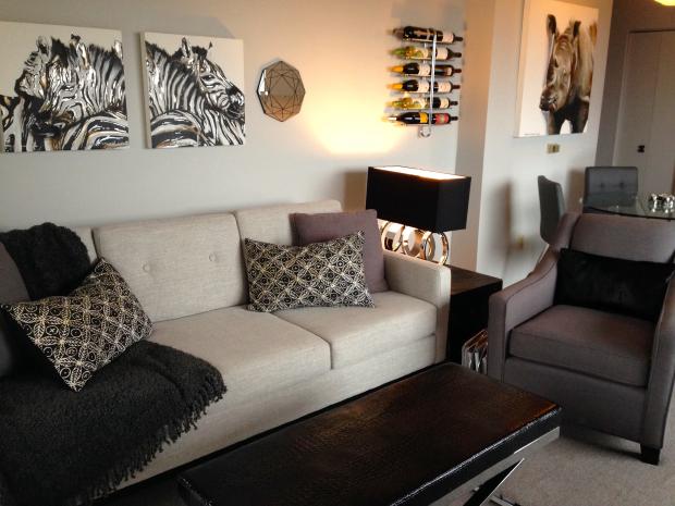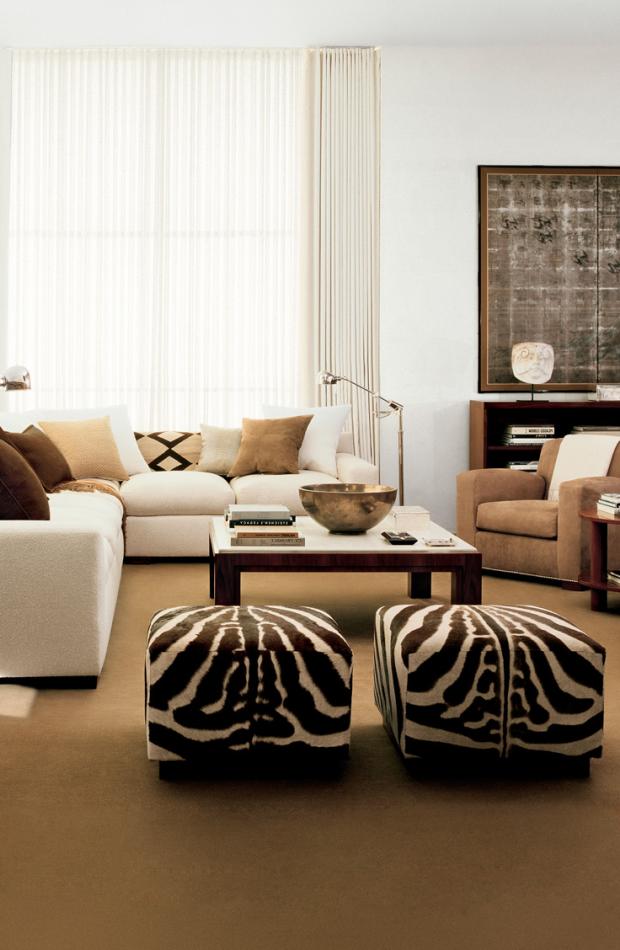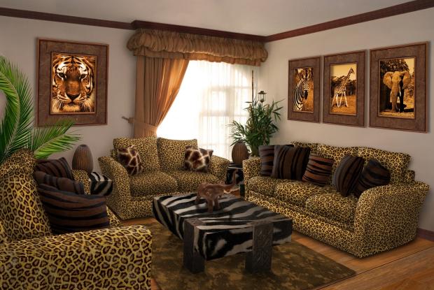 - Cоздайте комфортную диванную зону из мебели с текстильным или кожаным покрытием, но обязательно с африканским принтом на декоративных подушках или частях мебели; основа может быть однотонной.