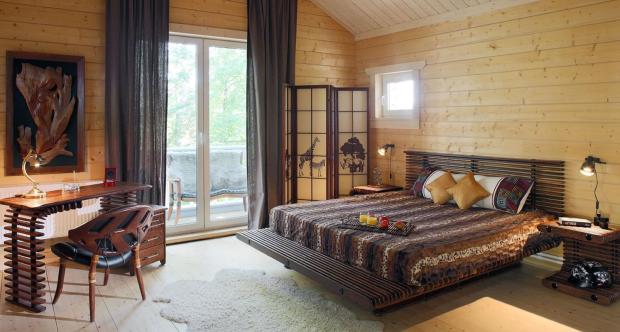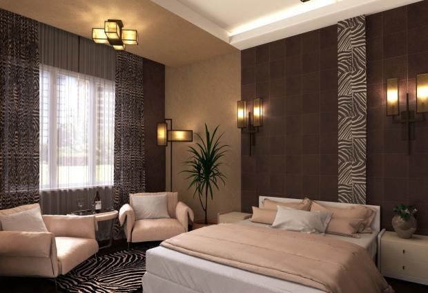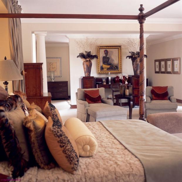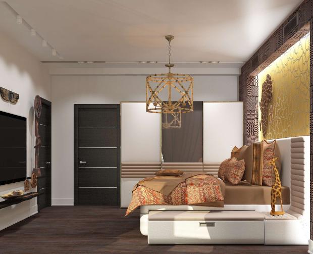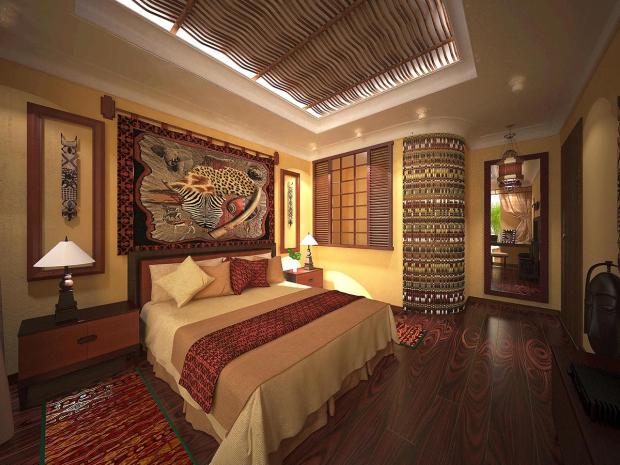 Африканский интерьер спальни должен располагать к отдыху и сну, поэтому отдайте предпочтение мягкой и спокойной цветовой гамме (пастельные, песочные тона с оранжевым оттенком).