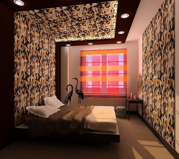 - В спальне, как и в гостиной, можно одну из стен дополнить африканским пейзажем или силуэтами животных.