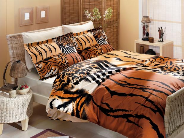 - Выберите деревянную, массивную кровать, покройте ее покрывалом с гладкой поверхностью и звериным принтом.