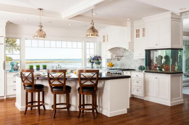 Аквариум в интерьере кухни устанавливают в нишах, как картину на стене или дверце холодильника, встраивают в барную стойку или шкаф. Чаще всего, кухня имеет маленькую полезную площадь, поэтому оправданный прием — вписать в стены или мебель. Из-за необходимости проветривать кухню, рекомендуем выбирать небольшой аквариум, который быстро нагреется после проветривания.