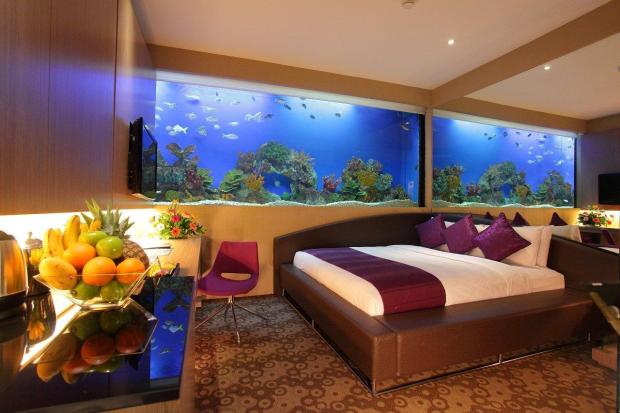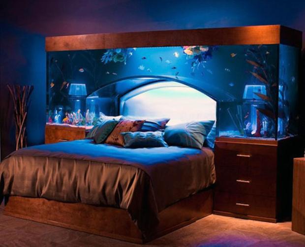 Аквариум в спальне не всегда оправдан, поскольку повышает влажность комнаты. Если в гостиной из-за большой площади влажность неощутима, как и на кухне с действующей вытяжкой, микроклимат спальни может стать экваториальным. Кроме того, аквариум нужно подсвечивать и фильтровать воду, что добавит света и шума в зону тихого отдыха. Самым оптимальным вариантом в спальне будет сухой аквариум.