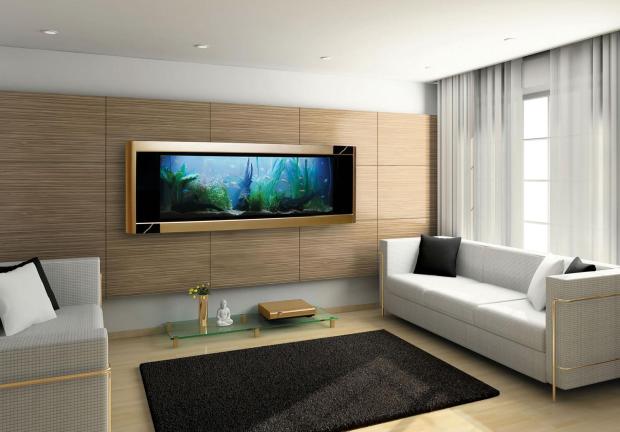 - встроенные в стену аквариумы – один из любимых дизайнерских приемов; аквариум сооружают в нишах и специально построенных конструкциях, часто на границе двух комнат или в качестве перегородки.