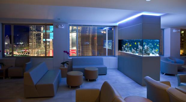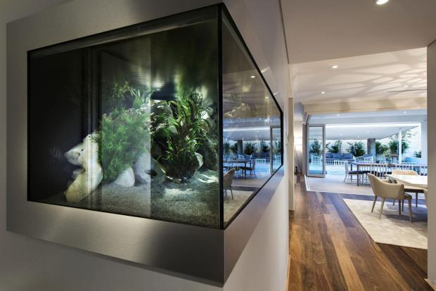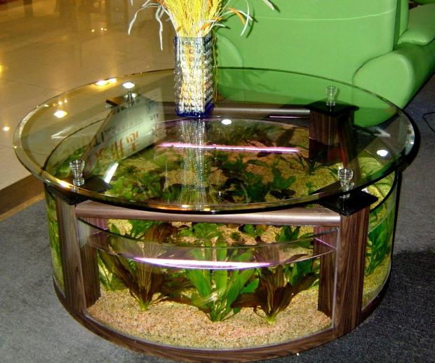 - встроенный в мебель аквариум все чаще встречается в магазинах: журнальные столики, шкафы-стенки, барные стойки становятся интереснее за счет подсветки и насыщенной жизни аквариумных жителей;
