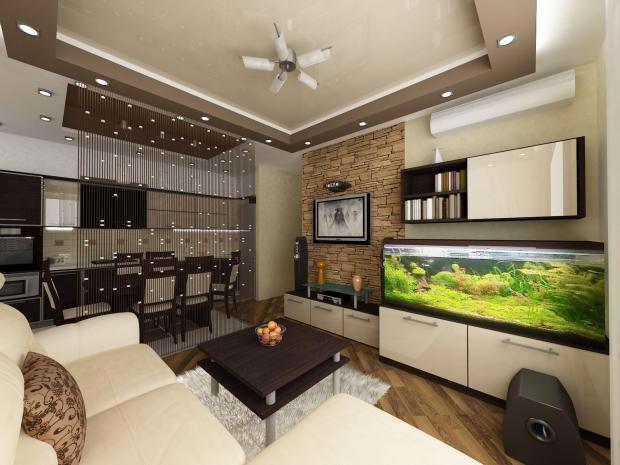Аквариум в интерьере гостиной размещается в виде отдельно стоящей конструкции, как ограждение между зонами кухни-гостиной, в качестве украшения на стену (аквариум-картина). Чтобы вода не цвела под палящим солнцем, рекомендуется располагать аквариум подальше от окон, допустимо размещение в темных углах комнаты.