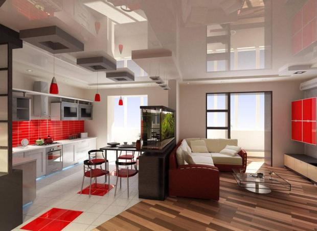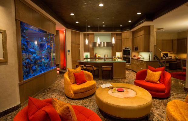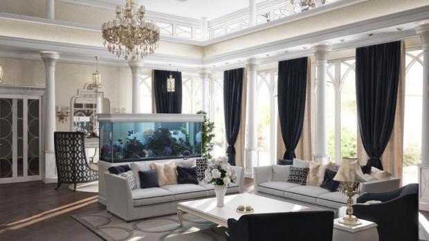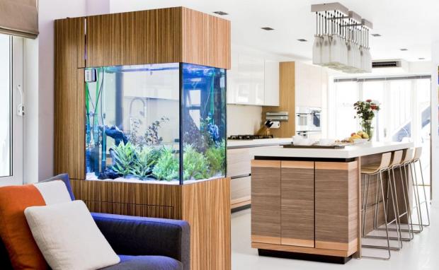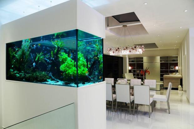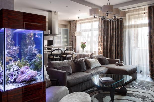 Аквариум в интерьере гостиной всегда привлекает внимание хозяев и гостей лучше любого декора. Но помимо эстетических качеств и успокаивающего эффекта от наблюдения за морской жизнью, аквариум увлажняет воздух, также аквариум может служить как эффектная перегородка в интерьере открытой планировки.