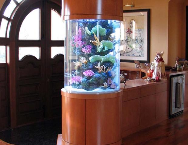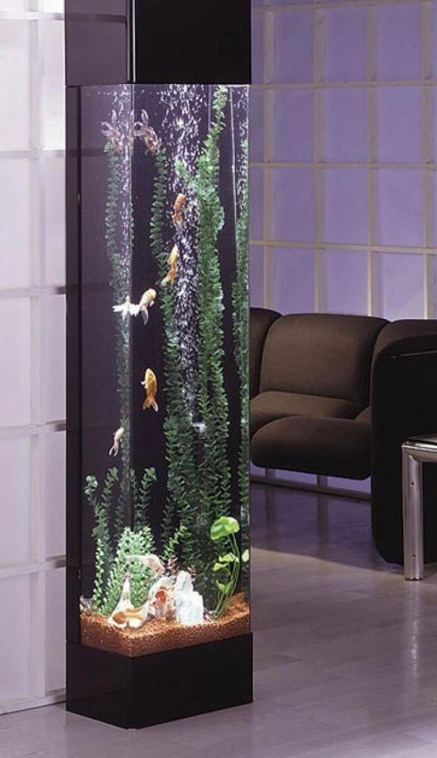 - аквариум-колонна это декоративный столб воды, который поддерживает потолок, но технически не является опорой; чаще всего устанавливается на границе зон одной комнаты в проходе;
