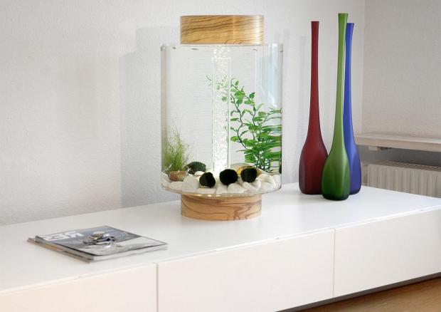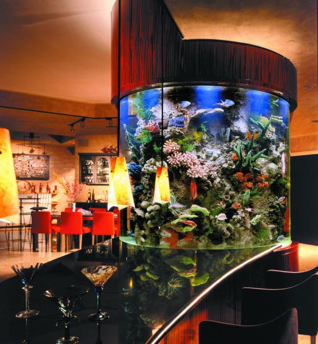- круглый аквариум в интерьере может быть малых размеров, как декор, или располагаться на полу на массивной круглой тумбе в высоту до потолка;