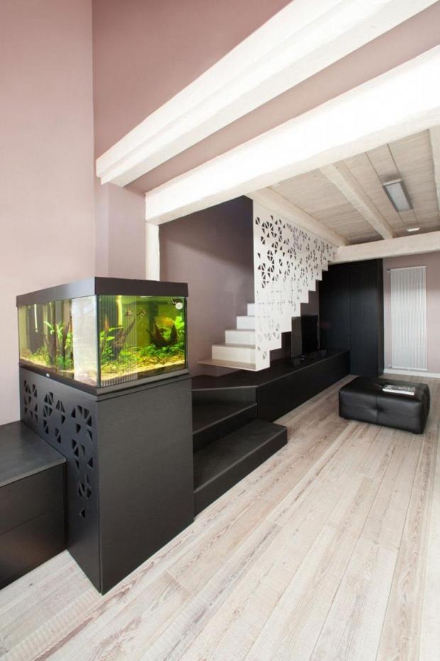 - Вписывать аквариум в интерьер необходимо до ремонта, учитывая его размеры (с оборудованием), необходимые условия и подводку воды-канализации (не дальше 10-15 м), если аквариум не является изначально герметичной системой.