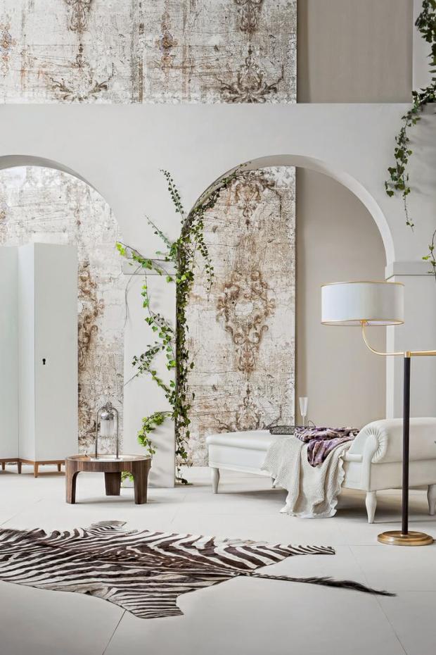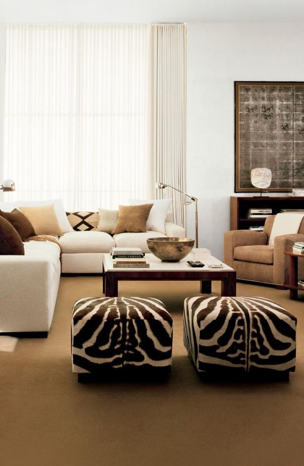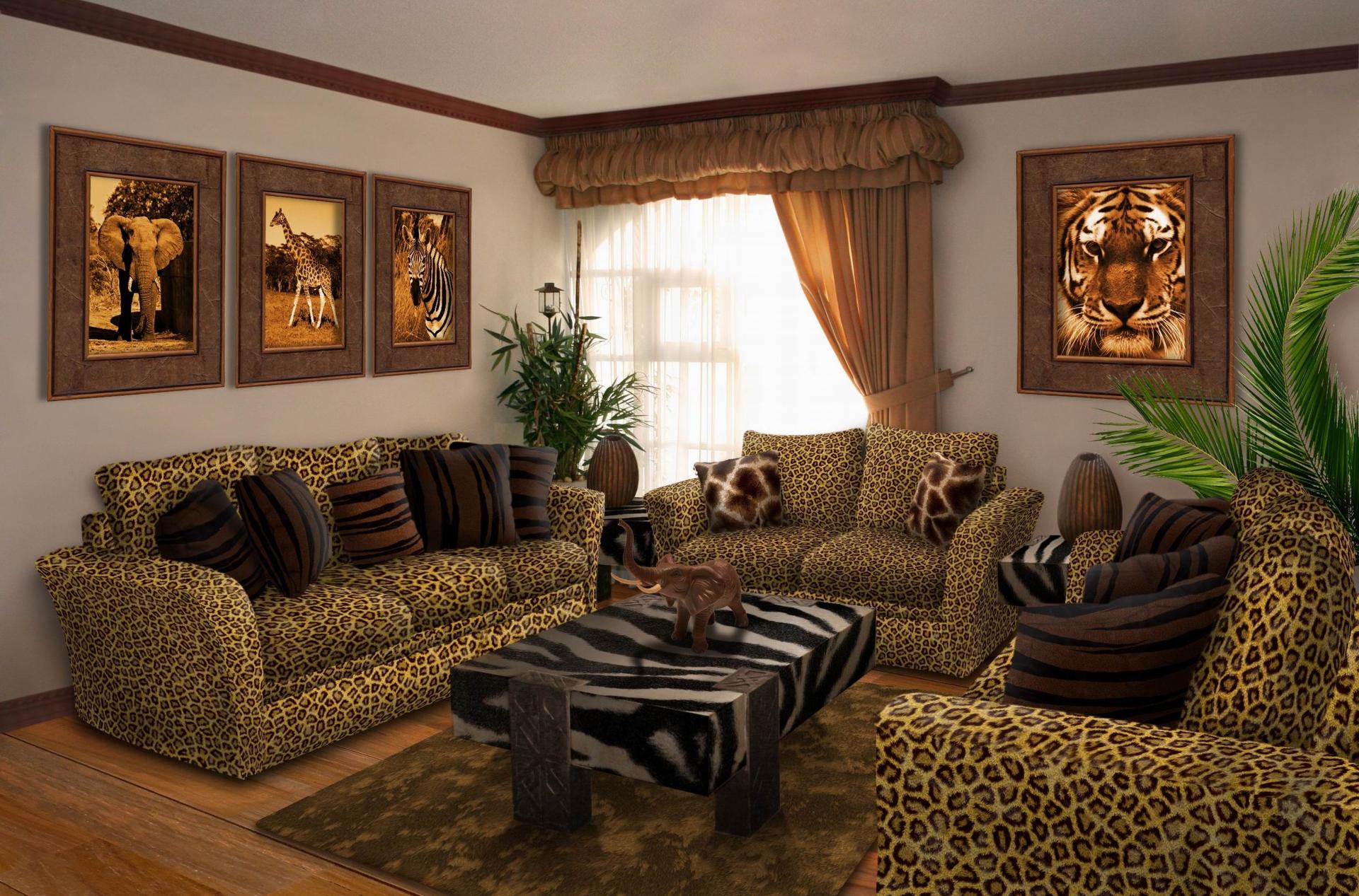 Шкуры, ткани и отделка, расцветка и/или фактура которых имитирует окрас и фактуру шкур животных. Использование шкур и текстиля — самый простой вариант внесения звериных мотивов, так как ковер, шторы, накидки на мебель, постельное белье или диванные подушки можно легко заменить, если узор на них не понравится или надоест.