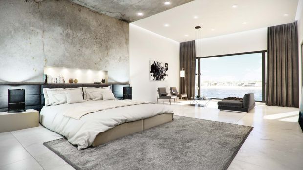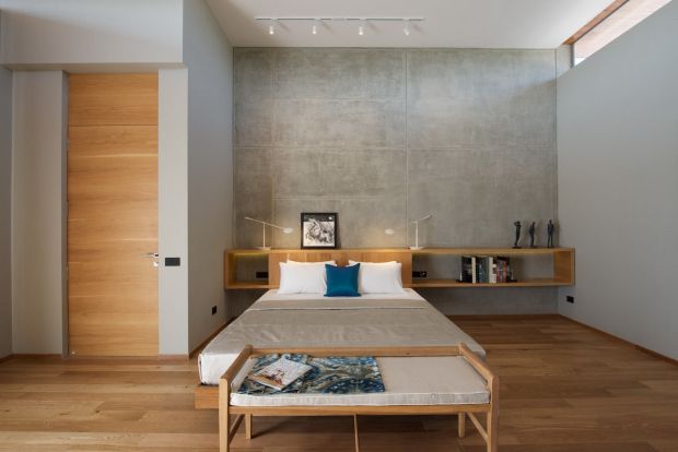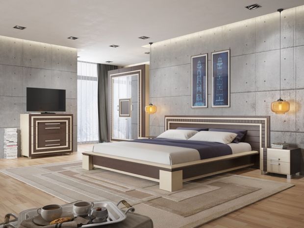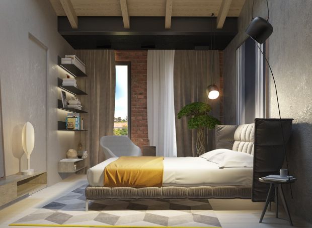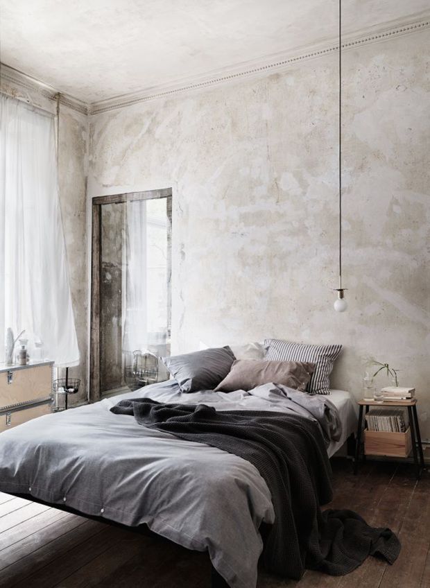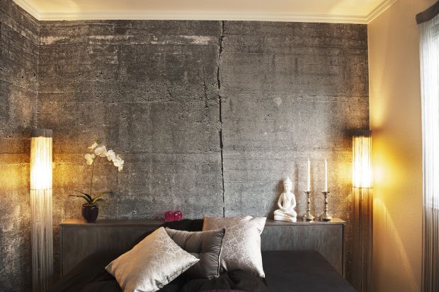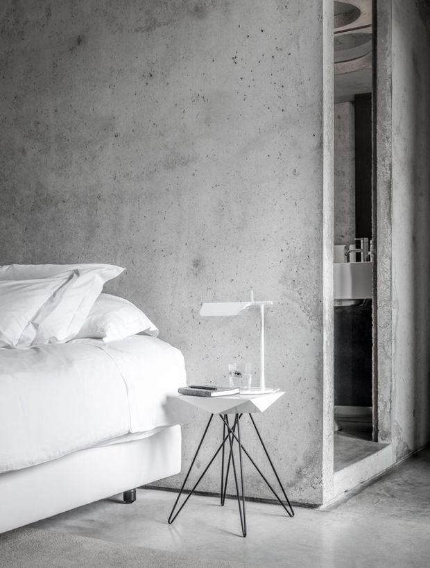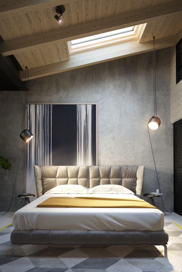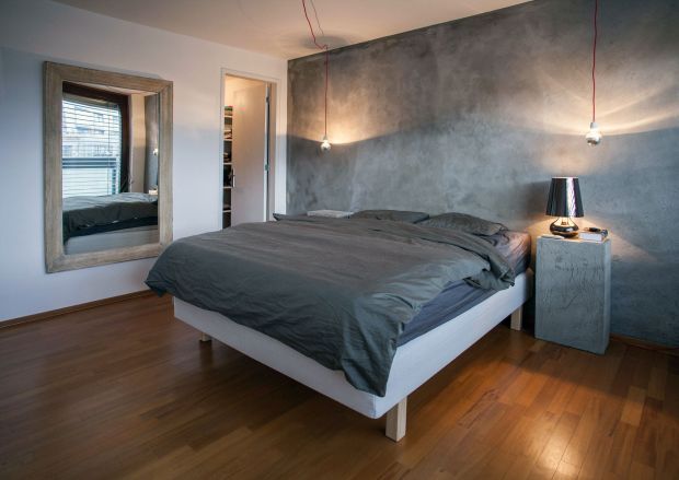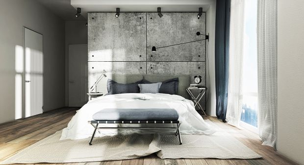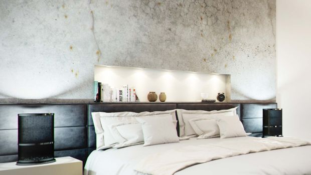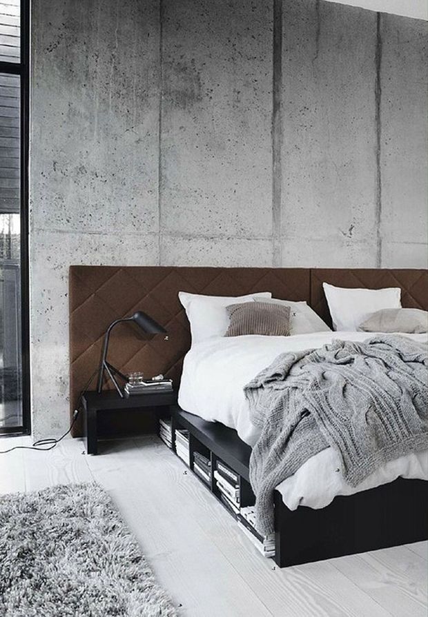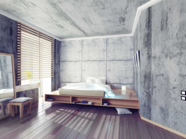 В спальне дизайнеры применяют бетон и в итоге получают уютный и располагающий к отдыху интерьер. Для этого задействуются декоративные возможности использования материала – теплые оттенки, узоры.