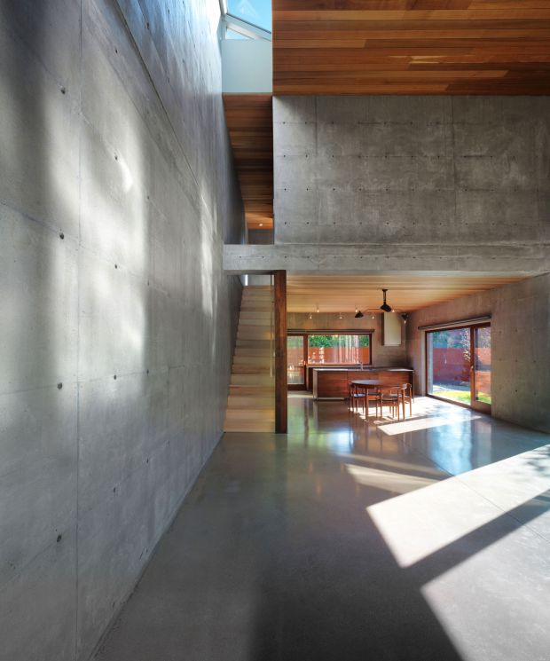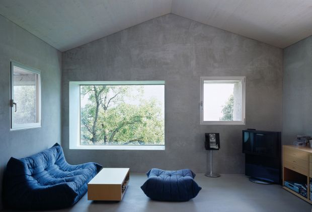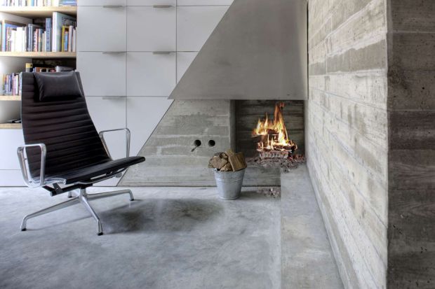 Слегка шершавая поверхность бетона потолка и пола эффектно смотрится с гладкими деревянными стенами. Потолок делают кремового цвета или белым за счет пигментов.