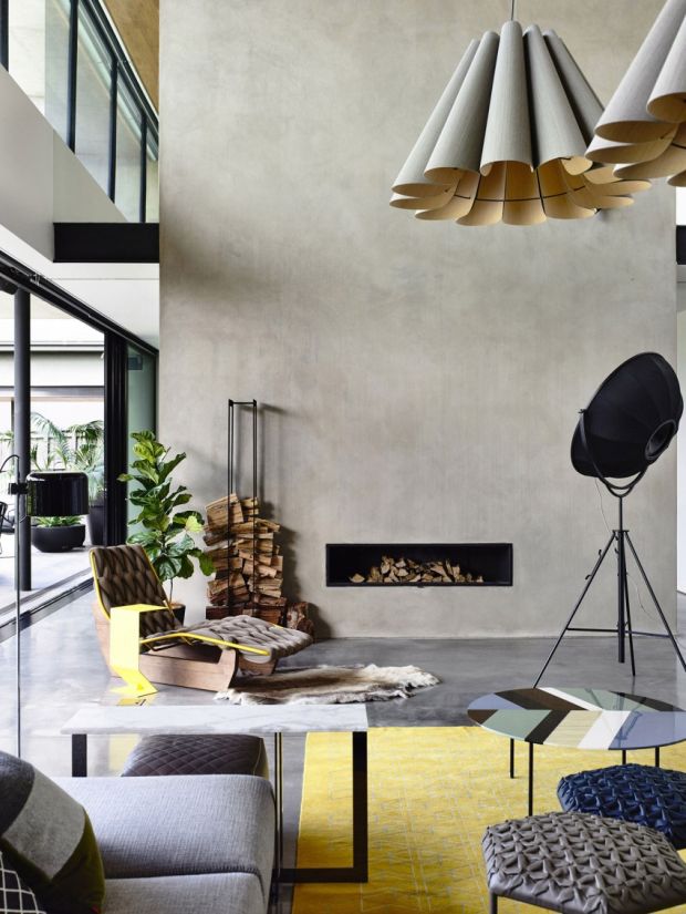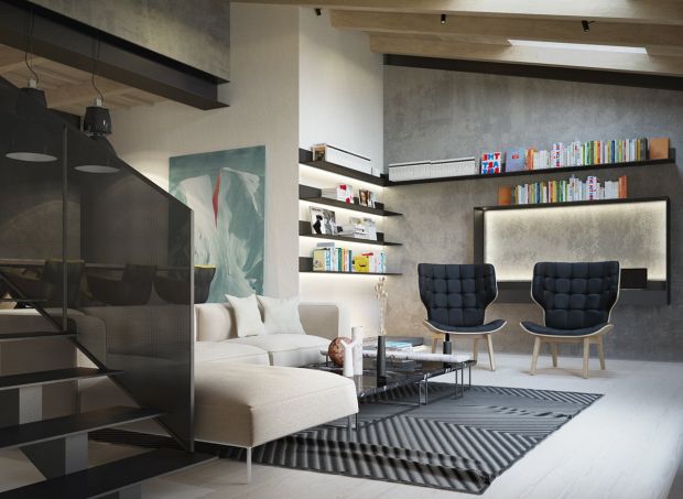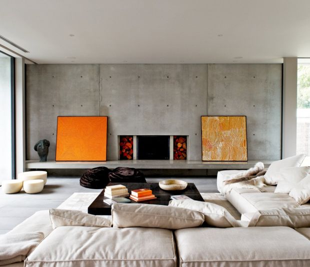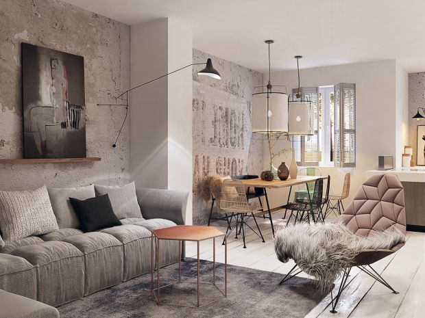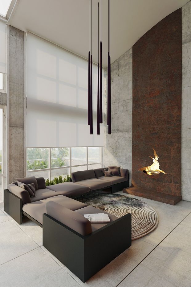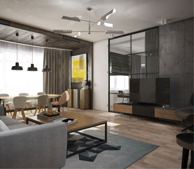 Если в гостиной нет стен из бетона, их можно имитировать с помощью готовых панелей или фактурного бетона, который наносится на черновую отделку.