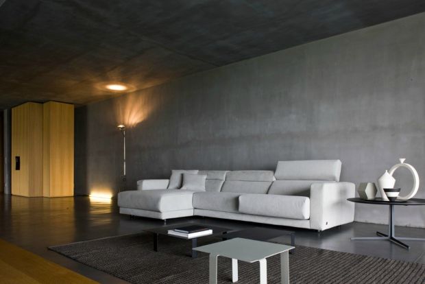 В небольшой гостиной бетонные стены целесообразно покрыть декоративной штукатуркой с фракциями цемента. Большие помещения будут выразительными, если материал будет в первозданном виде или с однородным цветным пигментом.