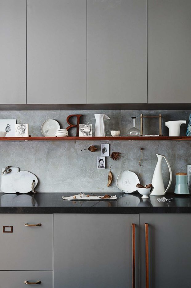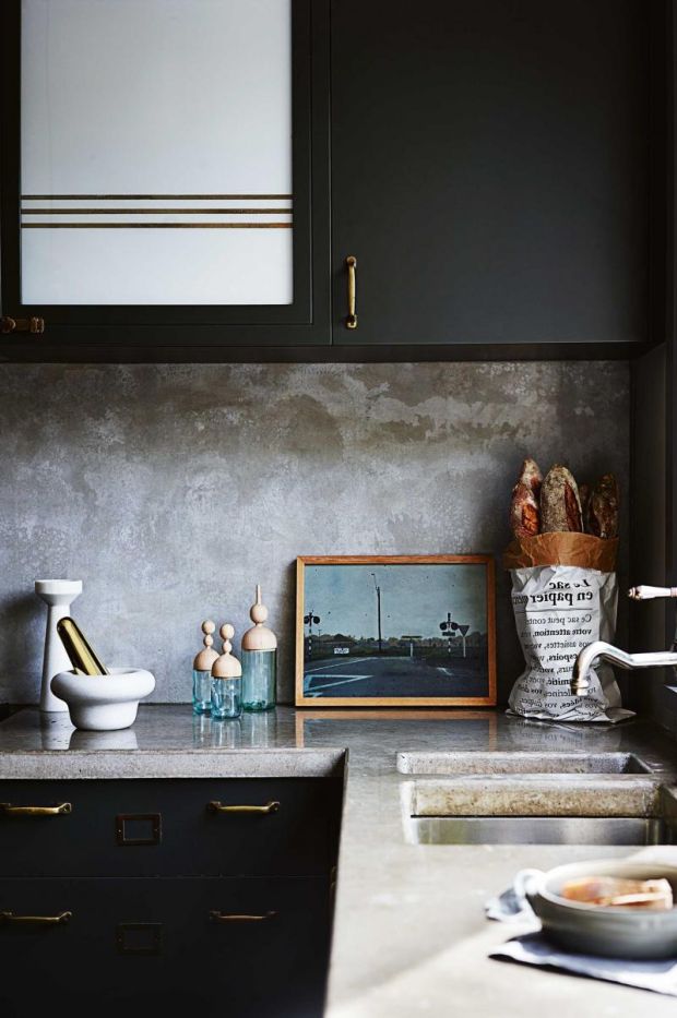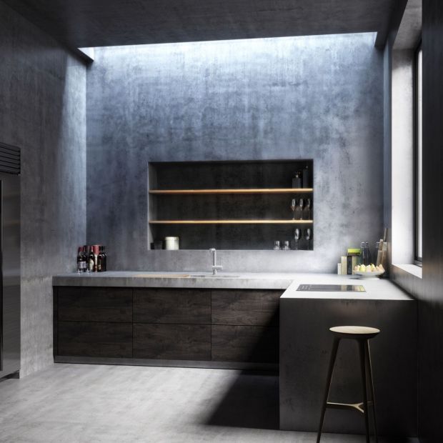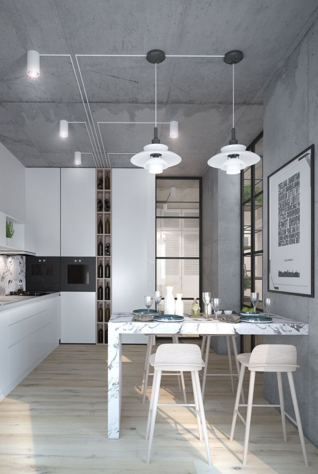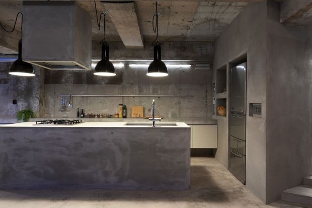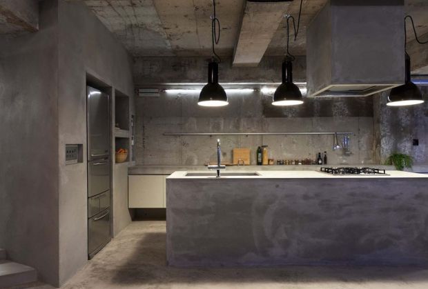 Бетон в интерьере кухни может представлять собой и пол, и стены, и потолок. Чтобы помещение не сливалось, делают разные тона. Например, белый или кремовый потолок, стены цвета металлик и темный пол.