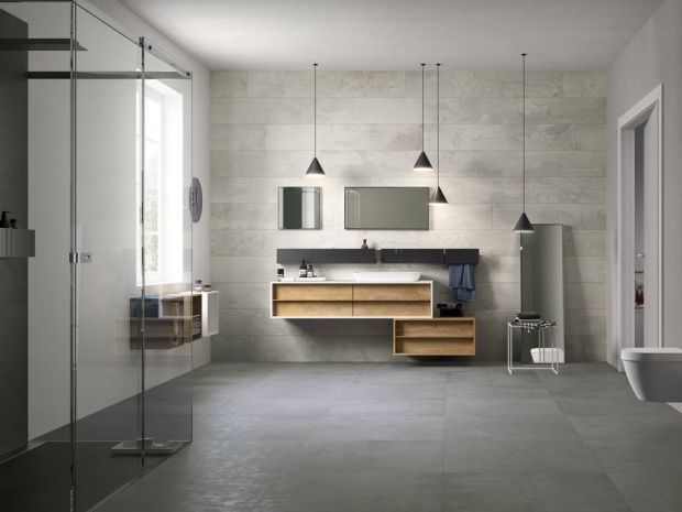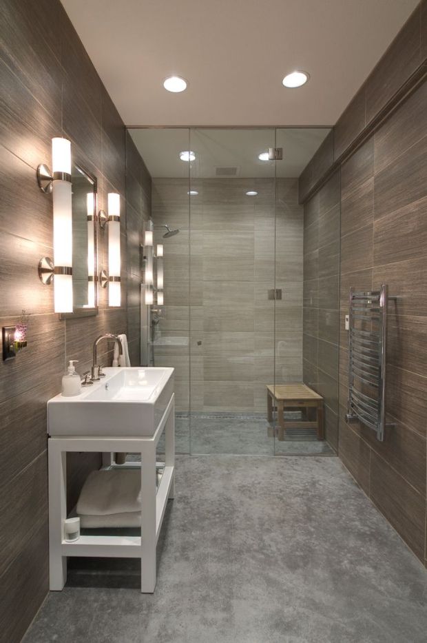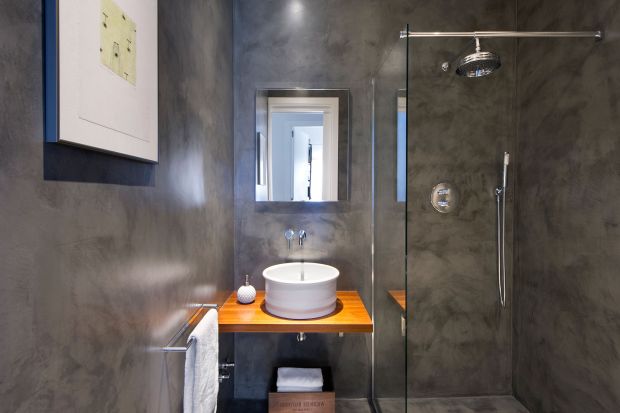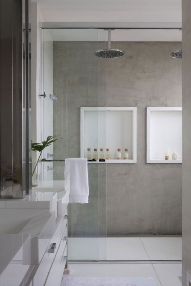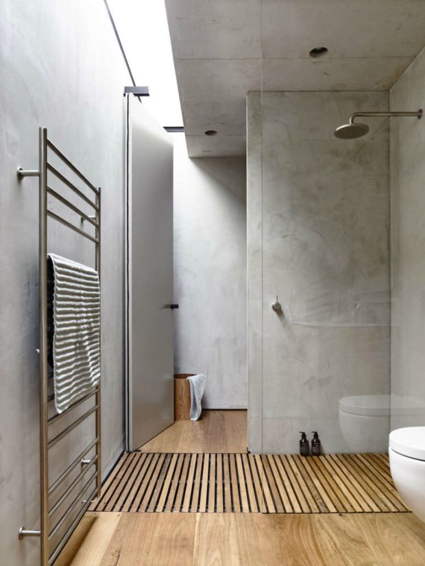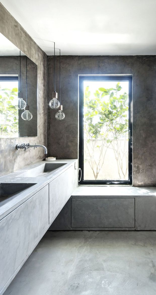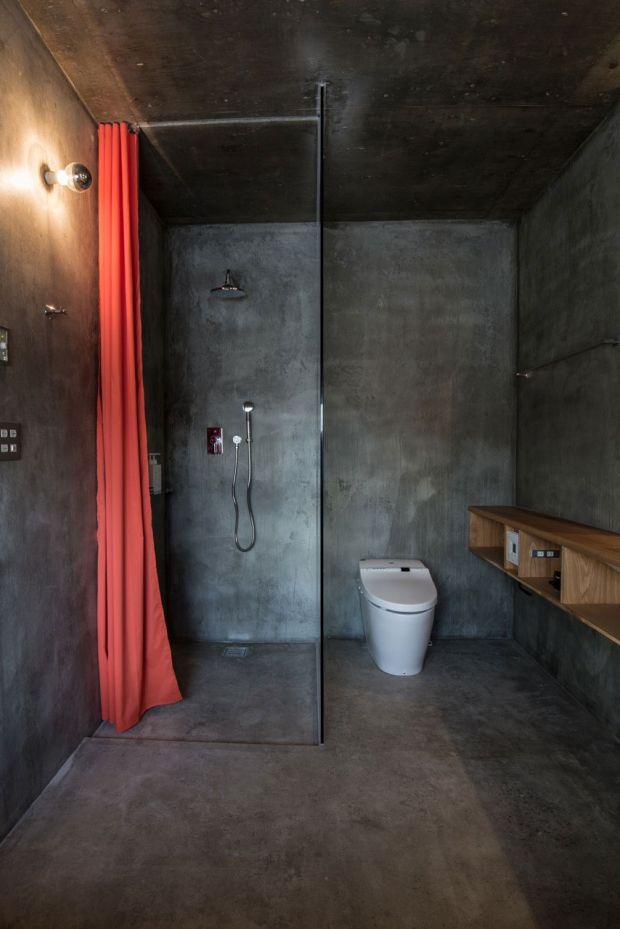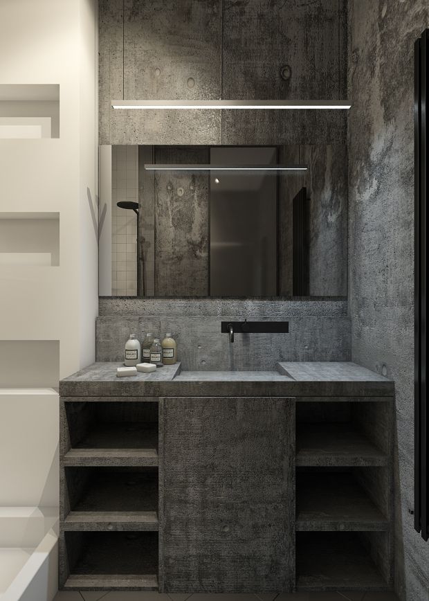 Зону раковины и душа отделайте плиткой, гармонирующей с цветом стен или закаленным стеклом, чтобы бетон не впитывал влагу.