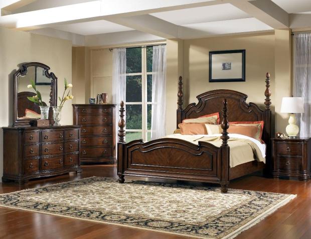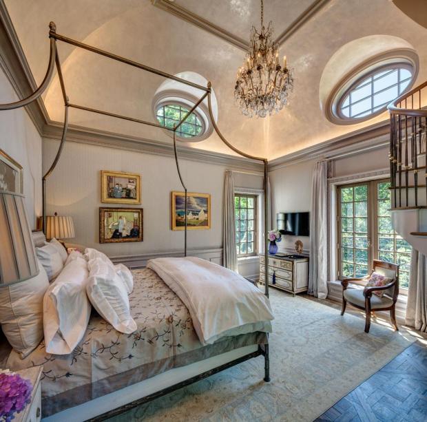 Изящная мебель в классическом стиле на изогнутых ножках с обилием накладного декора. Роскошный балдахин над кроватью, напоминающий королевскую мантию и пышные шторы с подхватами и ламбрекенами. Мелкий цветочный рисунок на мебели и текстиле.