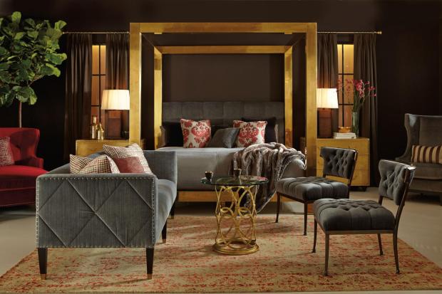 Другой вариант для будуара, более роскошный и "звездный". Пастельные оттенки категорически отвергаются в пользу приглушенных полутонов всевозможных "благородных" коричневых и серых оттенков: шампанское, капуччино, экрю, кофе, шоколад, серебро, бронза.