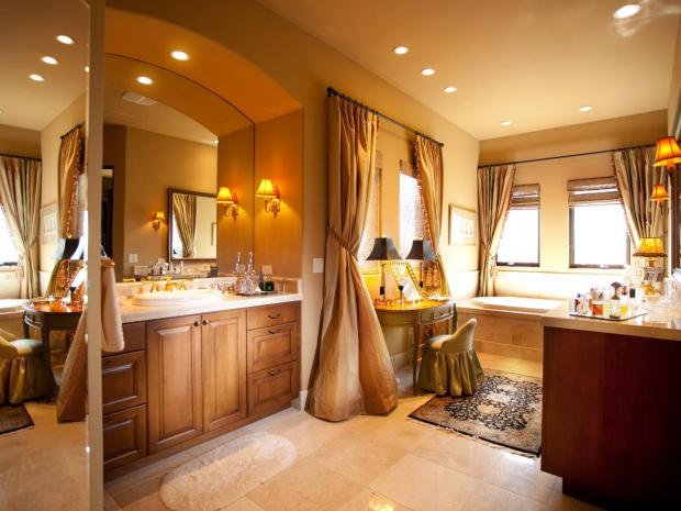 Ванная может быть разделена на 2 части: собственно санузел и комната отдыха. Минимум, что желательно иметь в зоне релакса – это кресло или диванчик-рекамье. В идеале – еще и массажное кресло, а также оборудование для работы парикмахера и мастера маникюра.