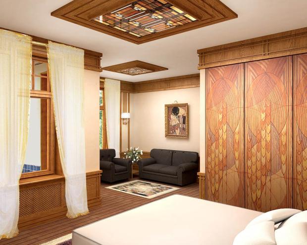 Много естественных материалов: камень предпочтительно светлый, а вот дерево темное. Плавные и обтекаемые формы мебели; несомненно, резьба. Немалой популярностью пользуются и витражные элементы в окнах, но это привнесенное.