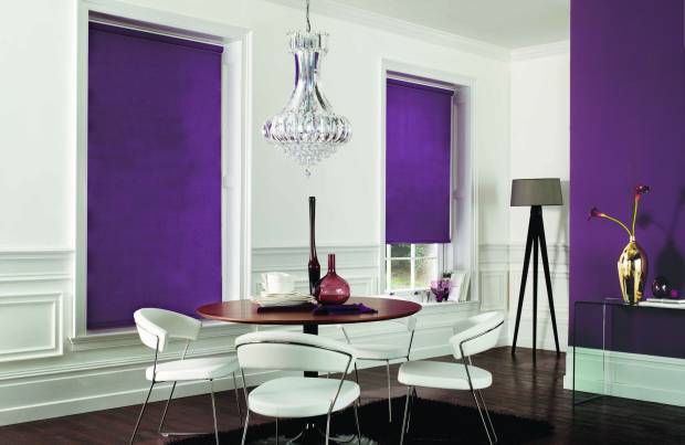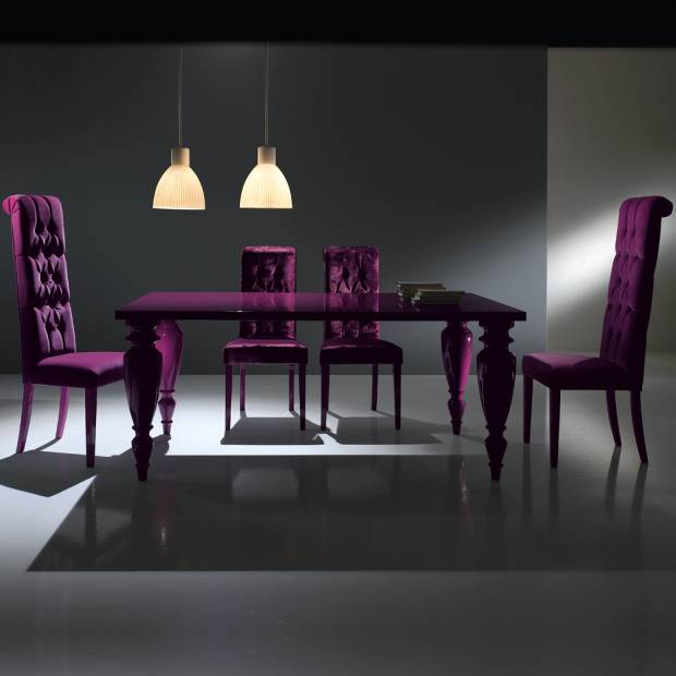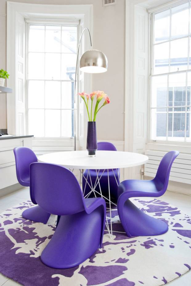 Доминирующий фиолетовый насыщенный цвет может психологически перегружать, а в маленьких столовых он будет скрадывать пространство. Он удачно комбинируется с серым, желтым, золотистым, зеленым, черным и белым цветом.