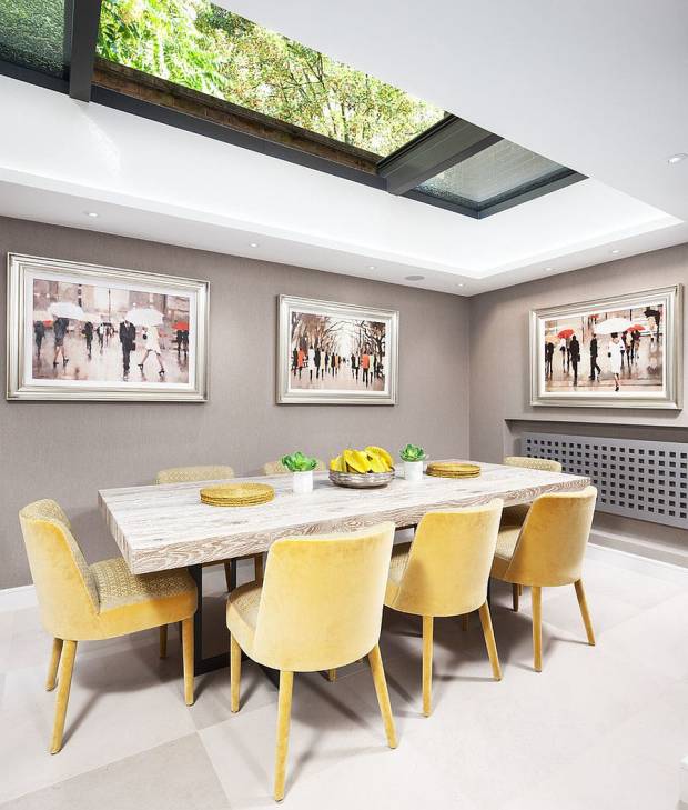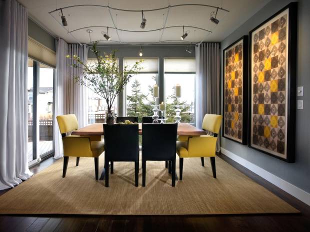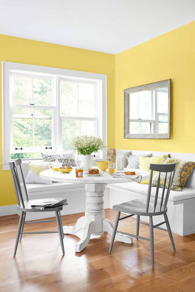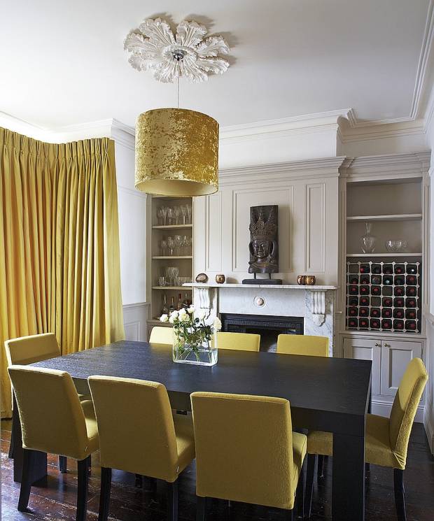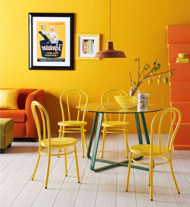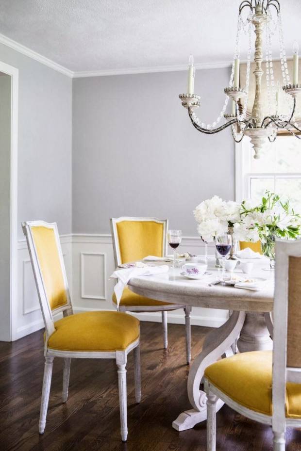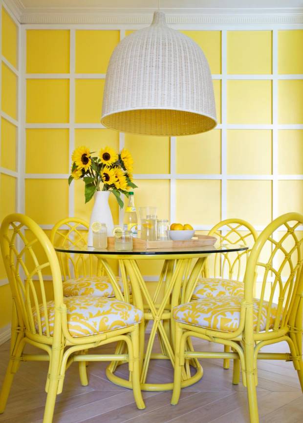 Солнечный желтый цвет сделает столовую яркой и сочной. Он круглый год будет дарить ощущение летнего тепла, ассоциироваться с урожаем и улучшать настроение. Желтый удачно комбинируется с оранжевым, синим, белым, фиолетовым и серым цветом. Чаще всего он не доминирует, а используется в сочетании с другими расцветками.