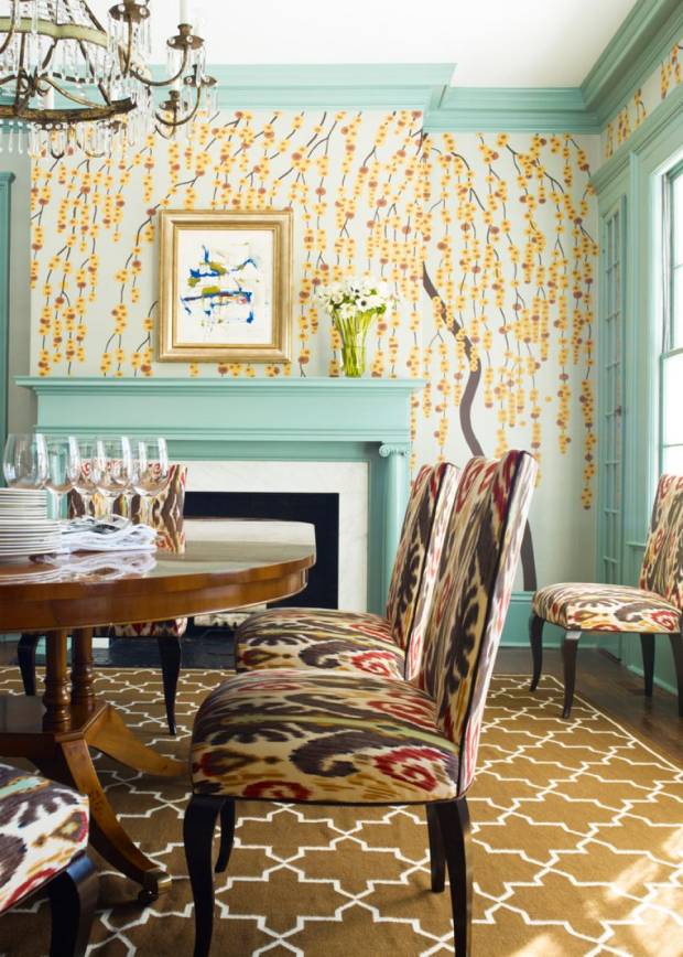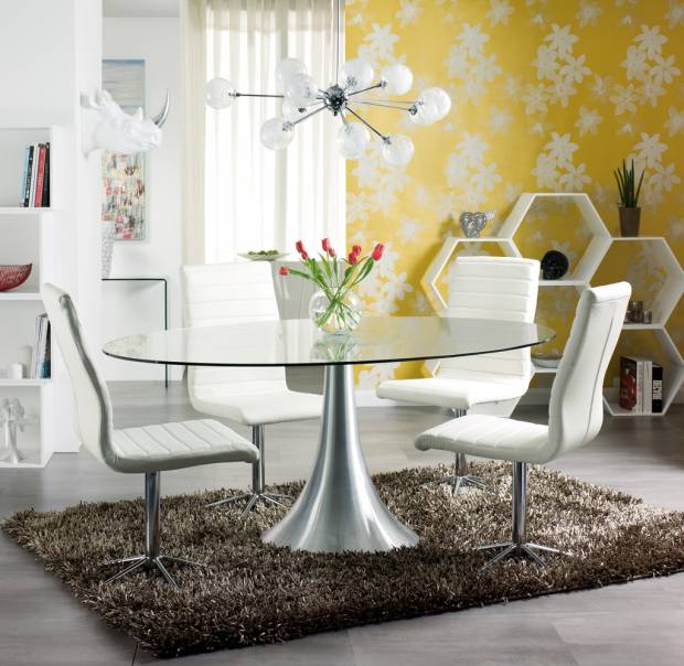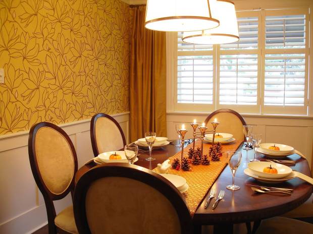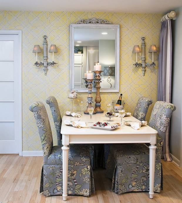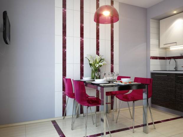 - Крупные узоры и фактуры используйте в больших столовых, а для небольших помещений выбирайте мелкие рисунки и фактуры – с их помощью столовая будет казаться больше.