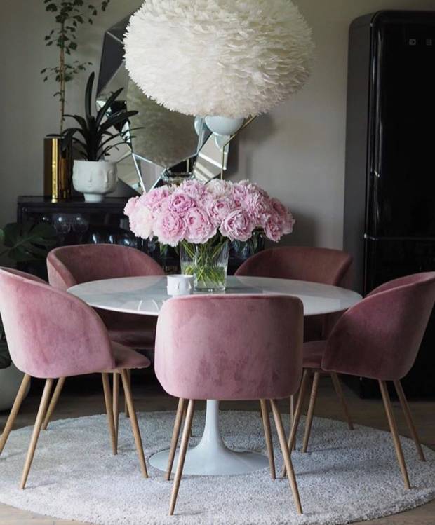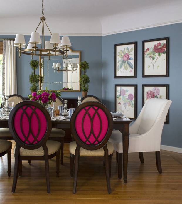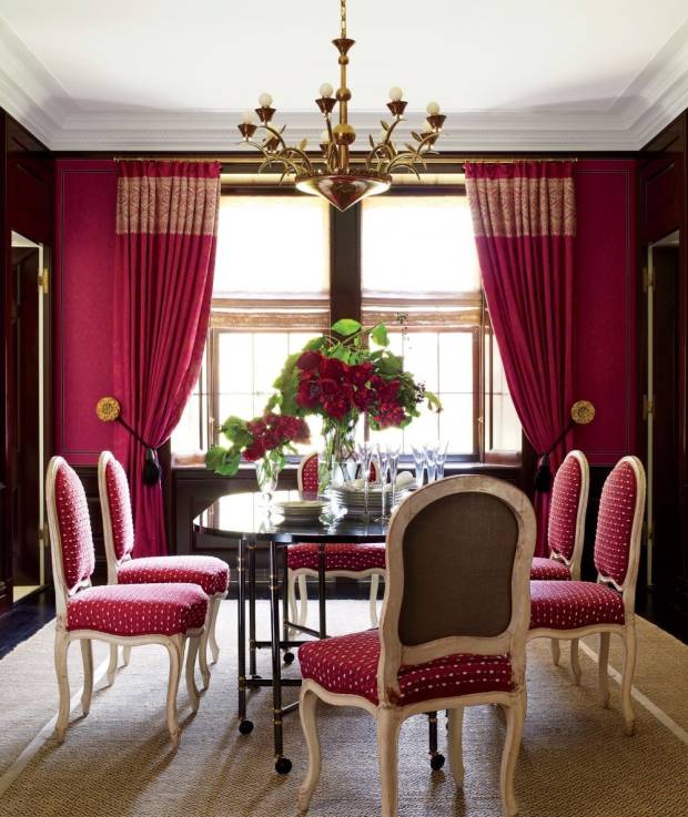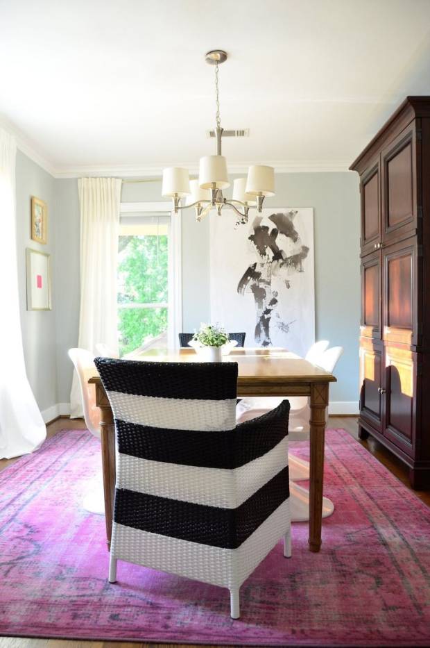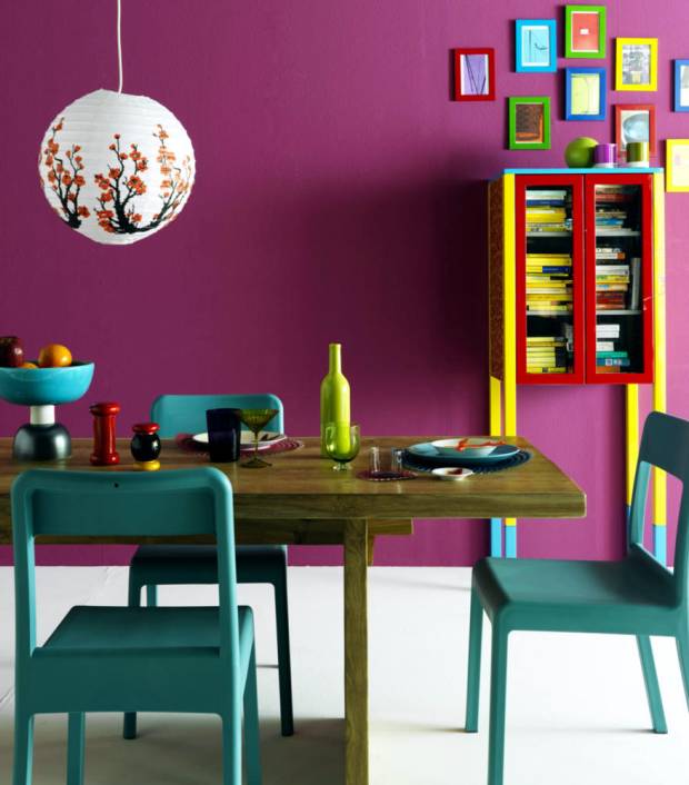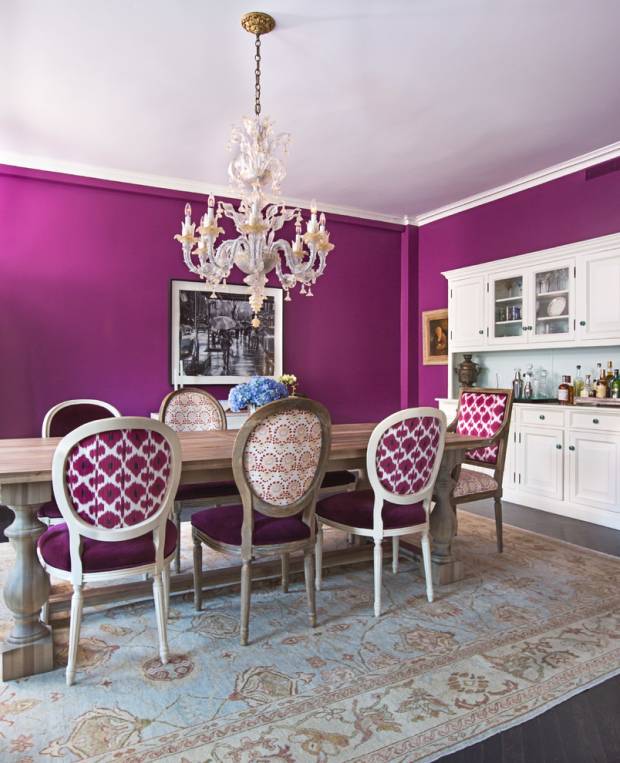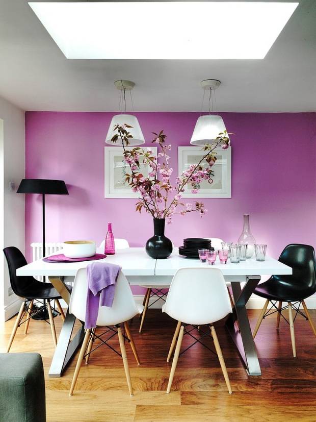 Если вы думаете, в какой цвет покрасить столовую в современном стиле, чтобы она была выразительной, выбирайте цвет маджента. Но, как и в случае с другими яркими и насыщенными тонами, не делайте его главным, а сочетайте, лучше всего с черным, серым или белым.