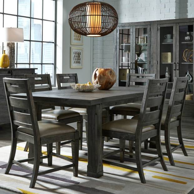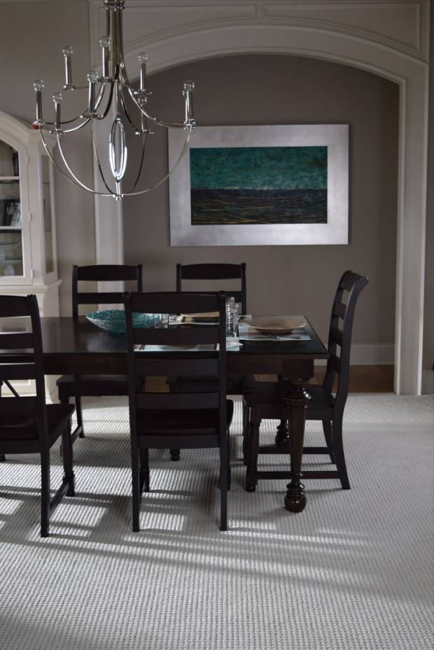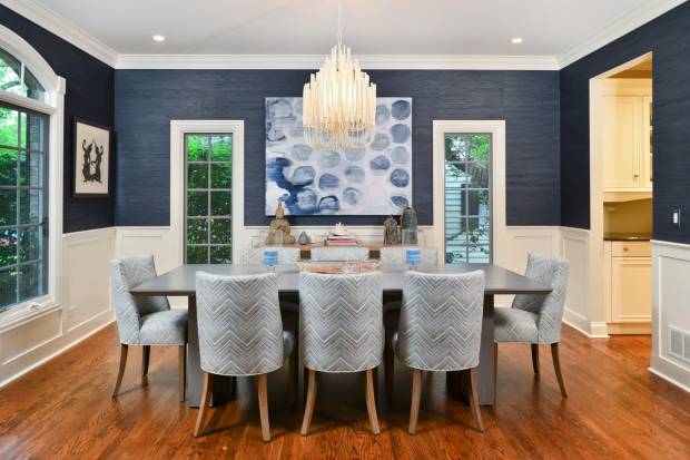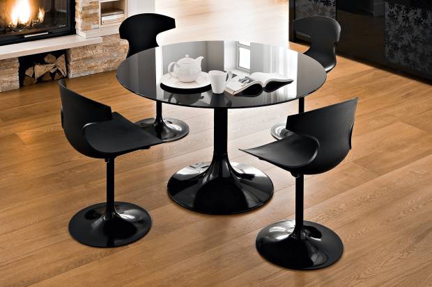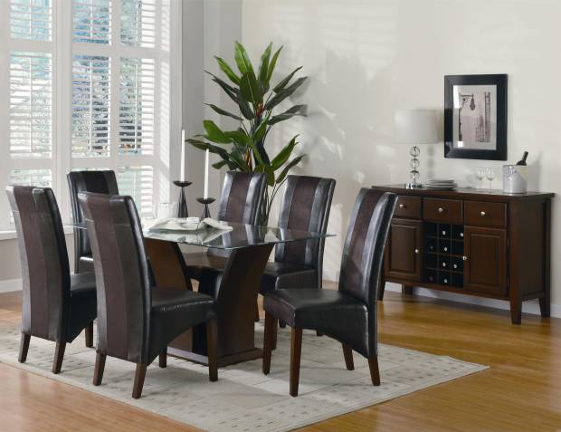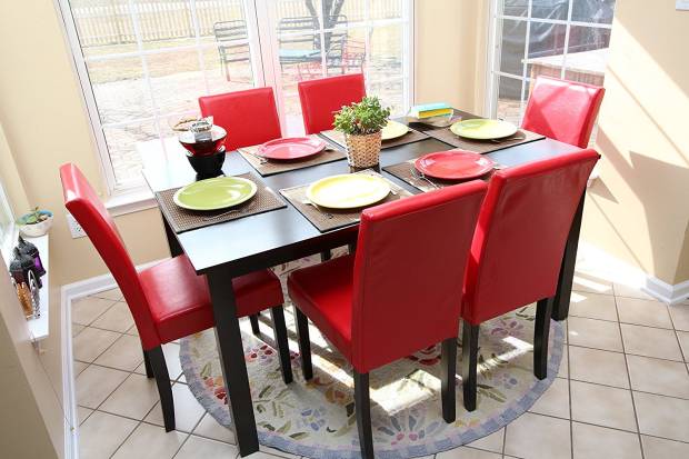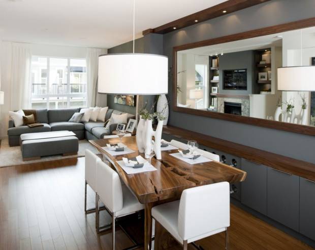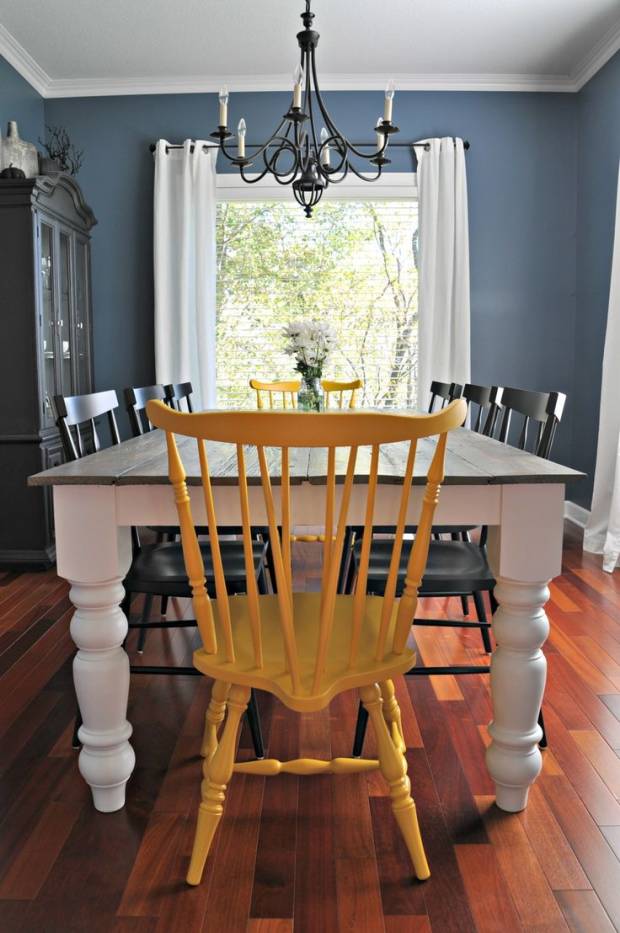 - Для обеденных помещений с большой площадью комбинируйте темные цвета со средней насыщенностью и яркие расцветки. Мебель в таком случае лучше выбирать двухцветную.