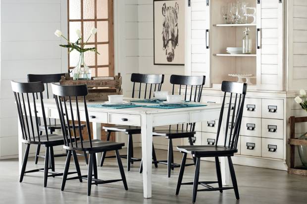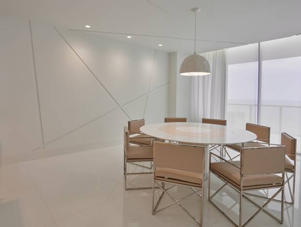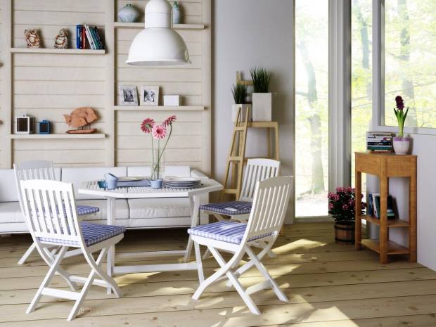 Столовая в белом цвете будет выглядеть изящной и воздушной. Белый хорошо сочетается со всеми тонам и задает контраст. Наиболее популярные комбинации с черным, красным и синим тоном. В качестве цвета потолков в столовой чаще всего выбирают именно белый.