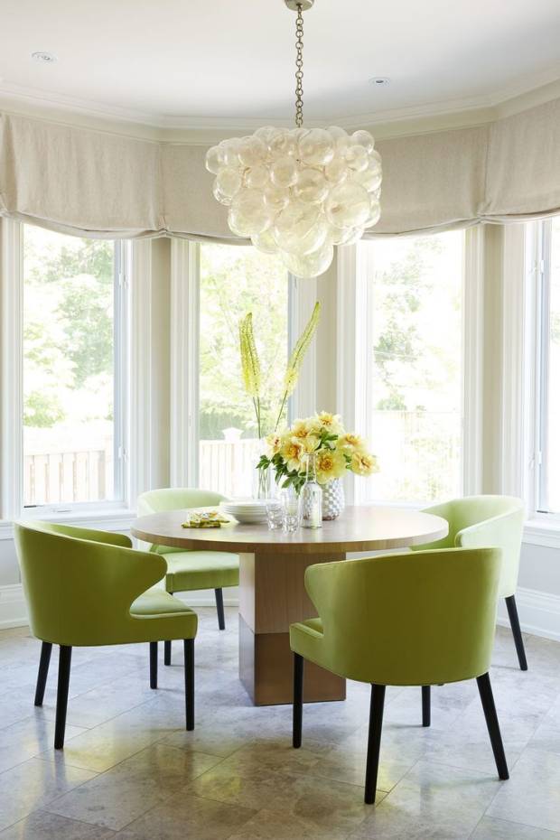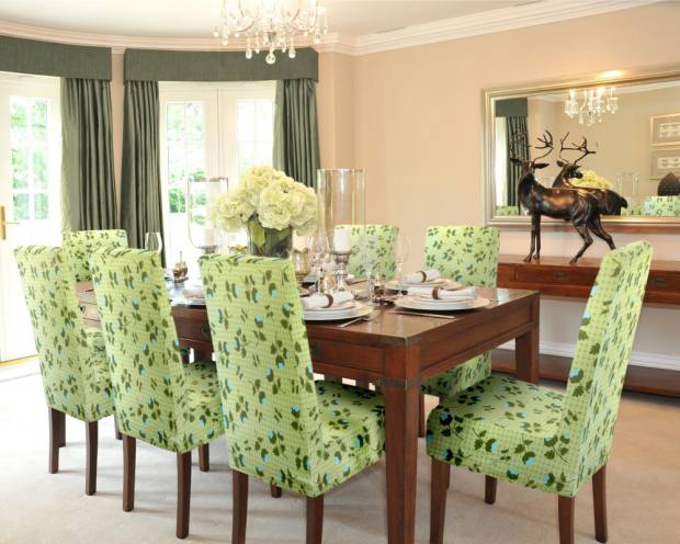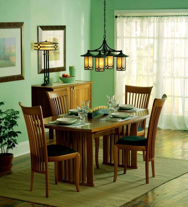 Зеленый цвет в столовой считается одним из самых выигрышных и популярных. Он олицетворяет природу и спокойствие. В такой столовой всегда приятно будет проводить время. Зеленый удачно сочетается с фиолетовым, белым, коричневым, золотистым.