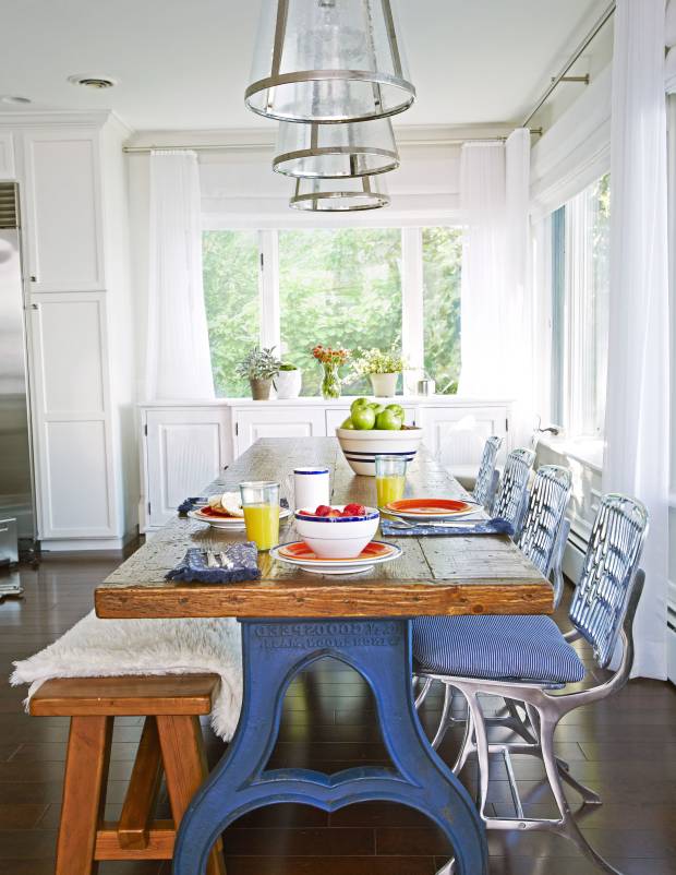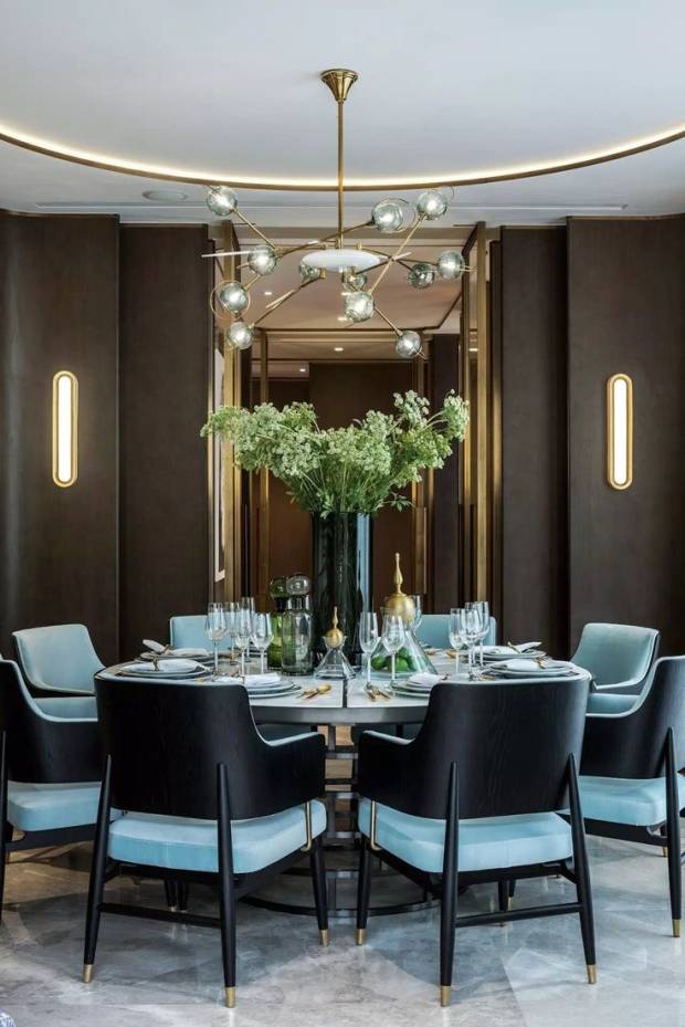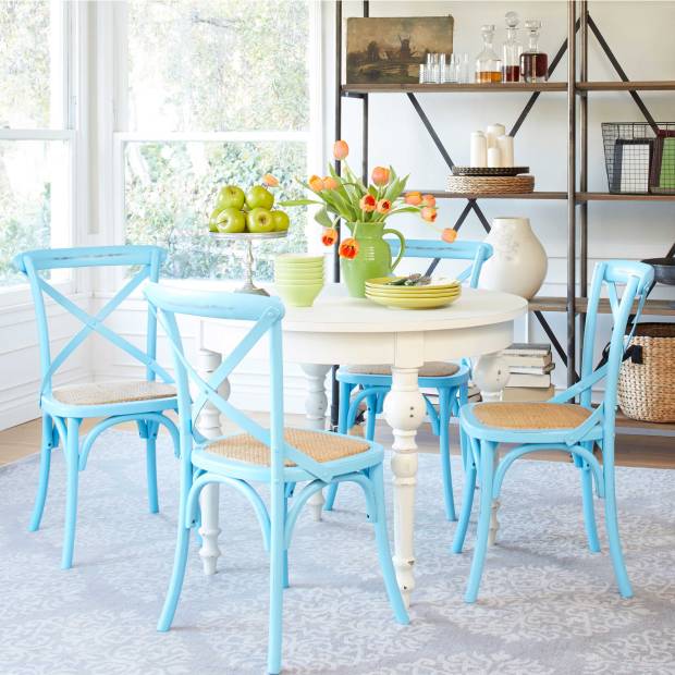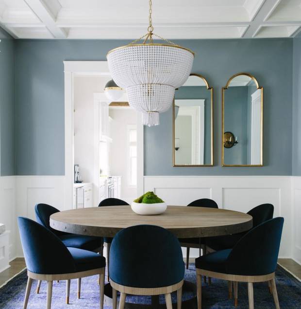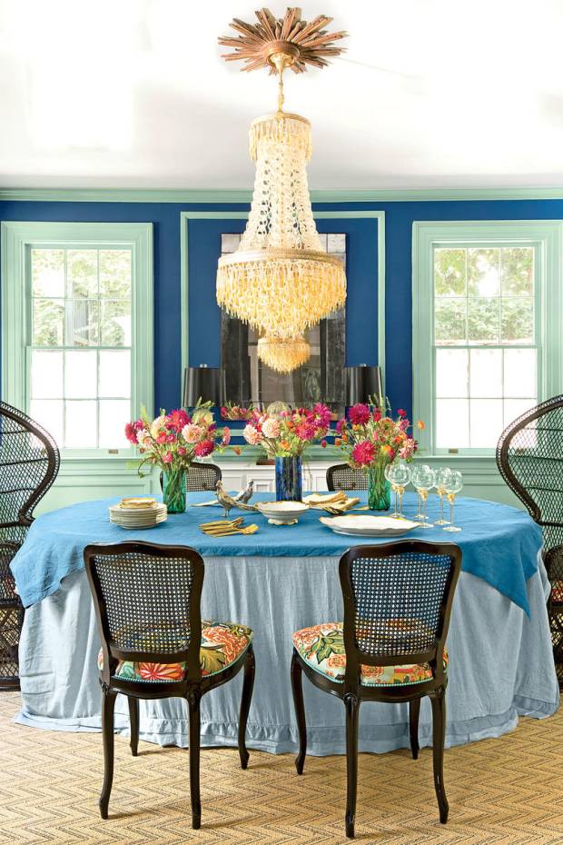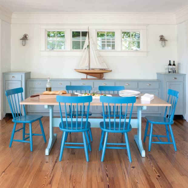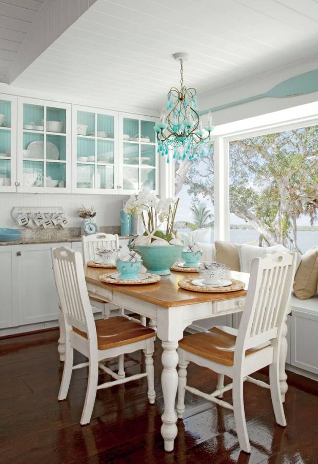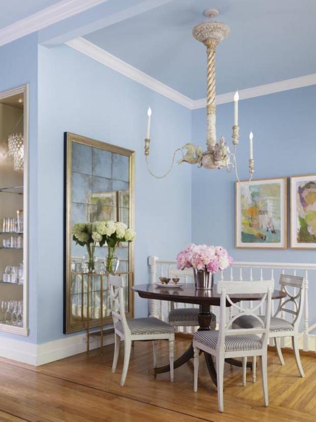 Столовая в голубом цвете у многих ассоциируется с морской свежестью и энергией водной стихии. Средиземноморские нотки ей придадут такие цвета: оливковый, салатовый, бирюзовый, лазурный, синий, белый, а также бежевый.