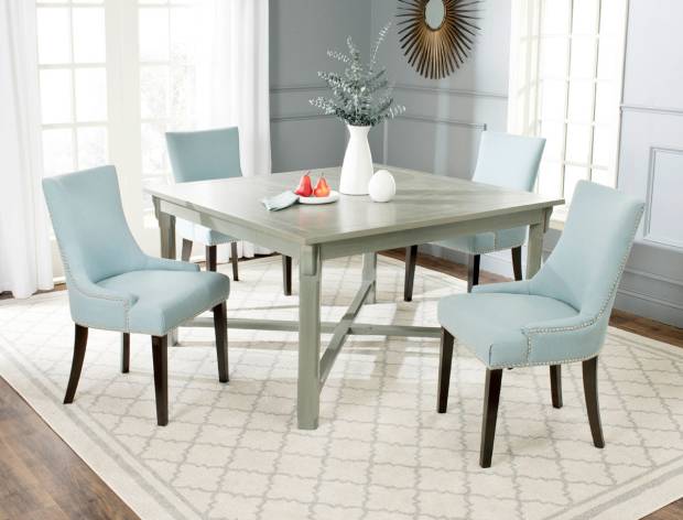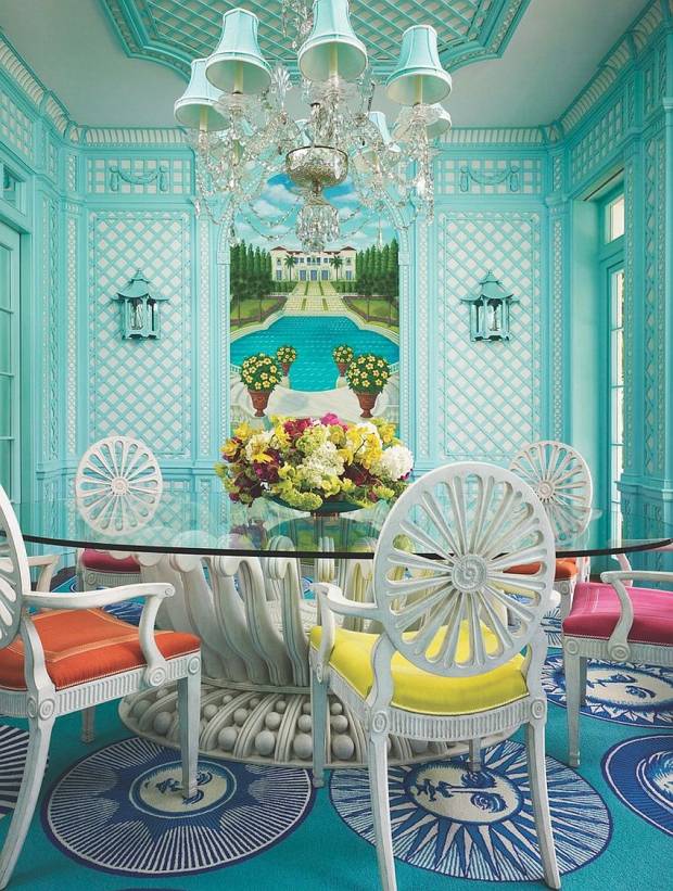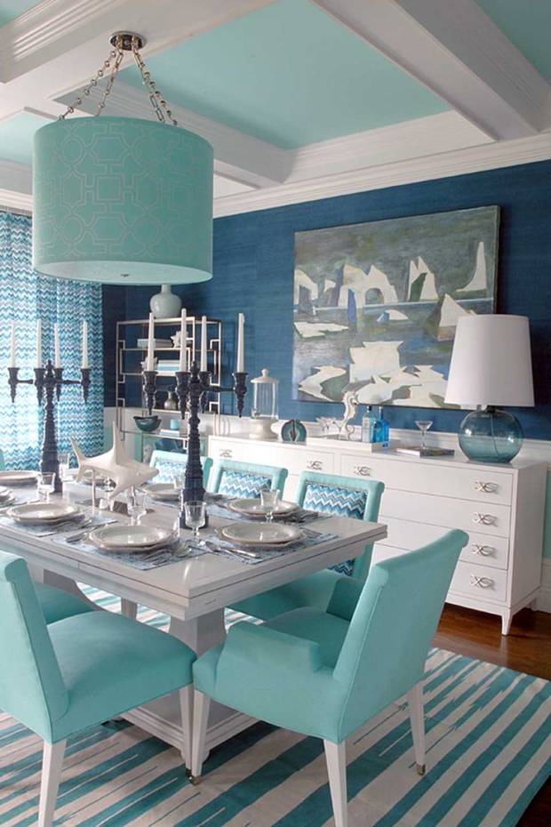Это ненавязчивый цвет в интерьере столовой. Он подойдет для помещений с морской или средиземноморской тематикой (как синий и голубой цвет). Напоминая лазурную гладь моря, он успокаивает и улучшает настроение. Гармонирует тон в интерьере с синим, голубым, белым, оливковым.