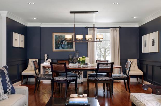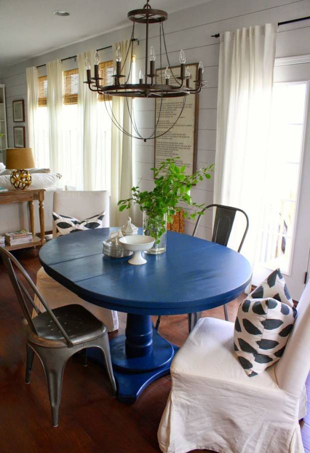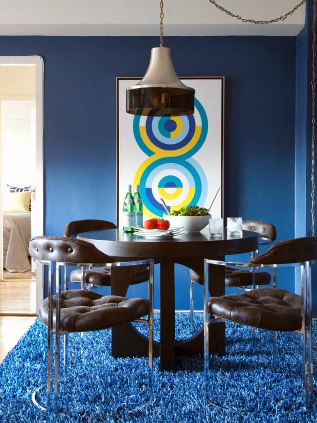 Благородный и глубокий синий цвет выгодно преобразит любую столовую, сделав ее выразительной. Столовая в синем цвете дополняет морскую тематику в интерьере. Синий желательно делать доминирующим в больших по площади столовых, чтобы он не скрадывал пространство. Основные сочетания – с желтым, коричневым, зеленым и белым.