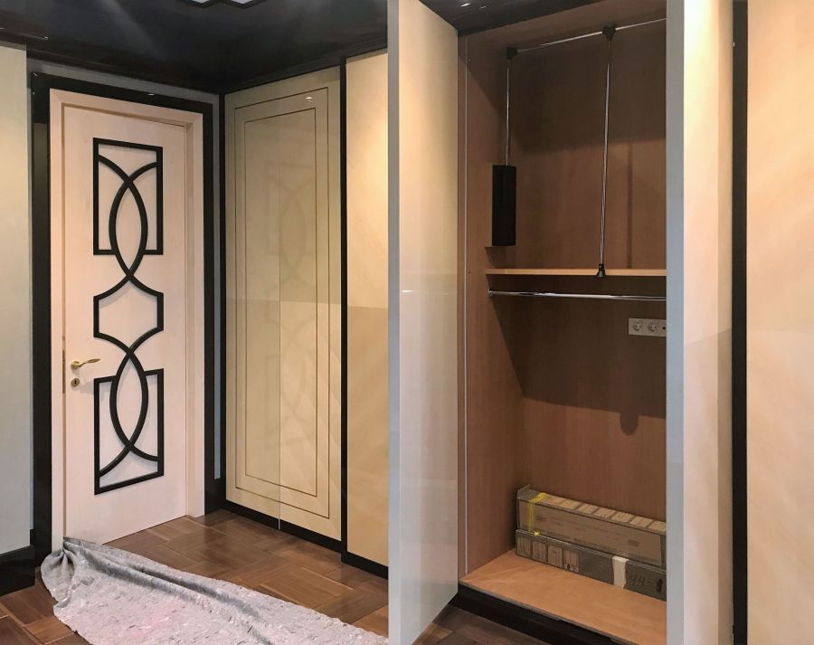 Идеи для дизайна и дорогого ремонта квартиры в новостройке – на фото с нашего объекта. В финишной отделке доминируют глянцевые панели из ценных пород древесины, мраморные слэбы, паркет миндального оттенка, хромированный металл, декоративное панно со стразами, текстильная обивка стен.