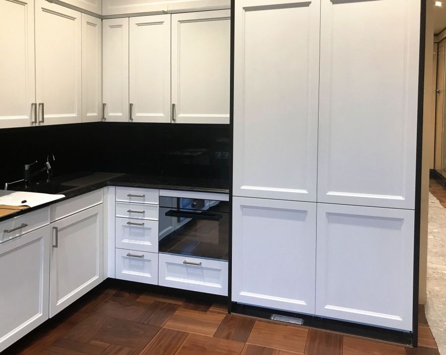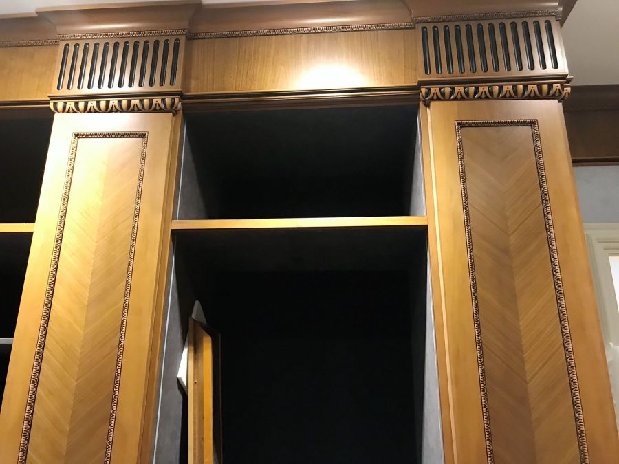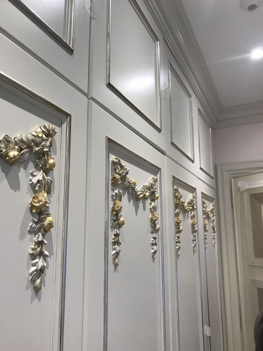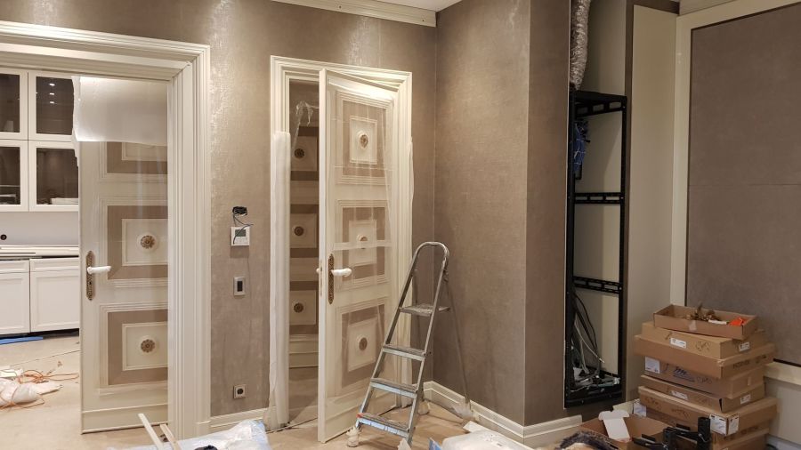 Рабочие процессы финишной отделки квартиры – на фото с реального объекта. В соответствии с проектом выполнены декорирование резьбой и лепниной, бронзовой аппликацией, цветочным рельефным узором, облицовка мрамором, сборка мебельных конструкций, монтаж всей электрики, в том числе распределительного электрощита и пр.