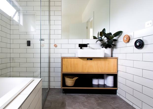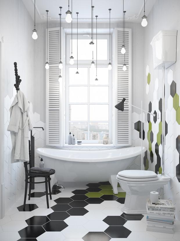 - Интересным акцентом скандинавского интерьера ванной комнаты может быть душевая шторка с принтом в виде морских глубин.