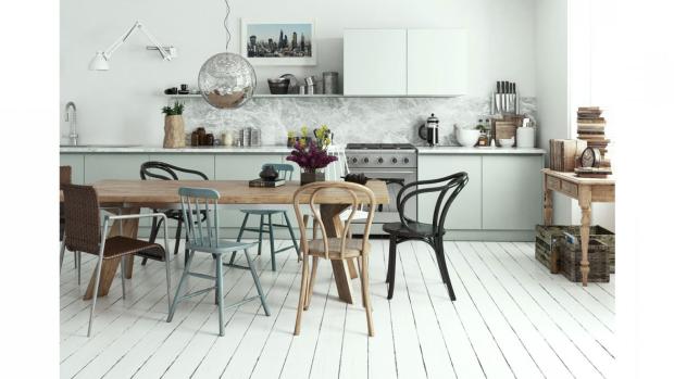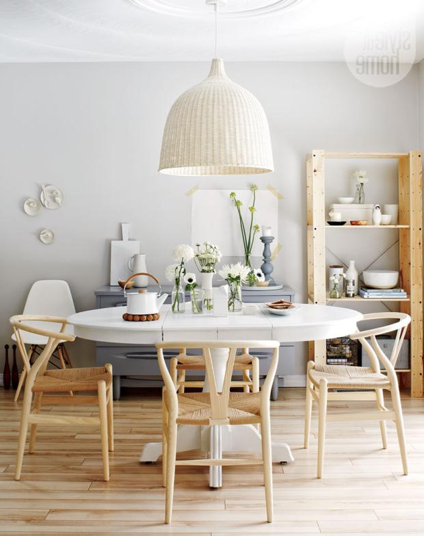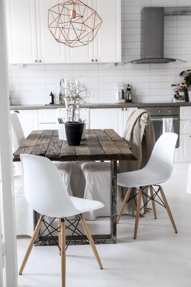 Обеденный стол подберите с деревянной поверхностью и тонкими ножками. Стулья – из натурального дерева без массивных ножек и спинок.
