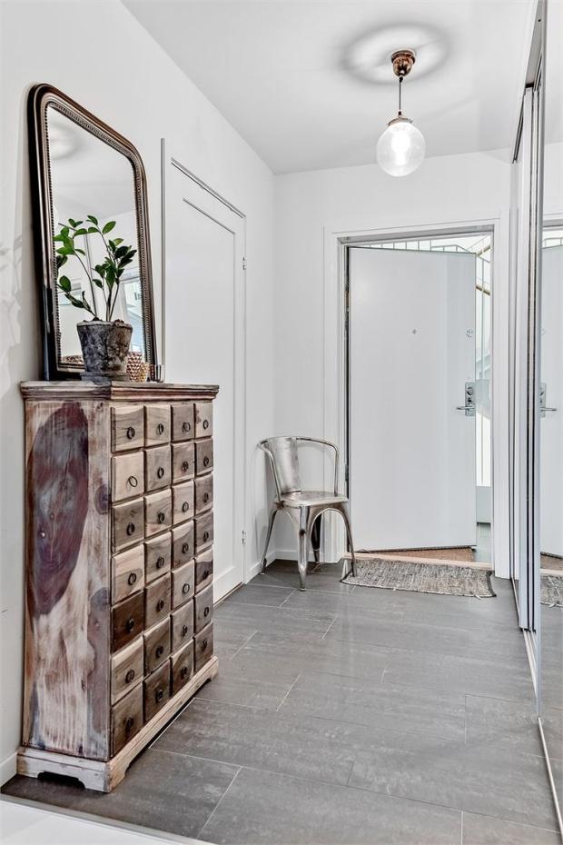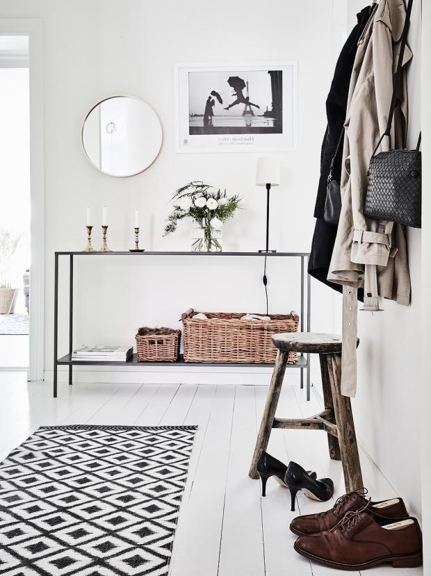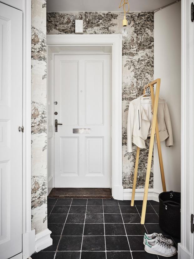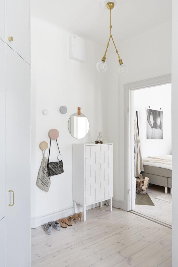 Дизайн прихожей в скандинавском стиле включает в себя лишь самую необходимую мебель – комод, напольную вешалку для одежды гостей, небольшого или среднего размера зеркало. Также можно поставить шкаф с дверками створчатого типа, в котором будет храниться верхняя одежда. Нередко делают вешалки, прикрепленные к стене.