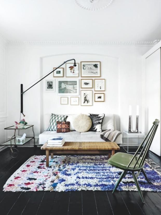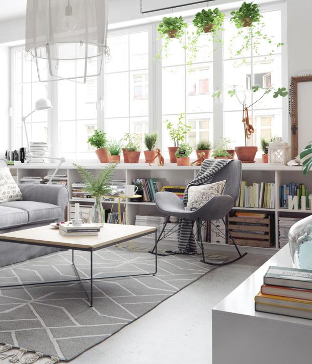- На пол в зоне дивана постелите теплый ковер. Также в комнату впишется книжная полка с любимой литературой