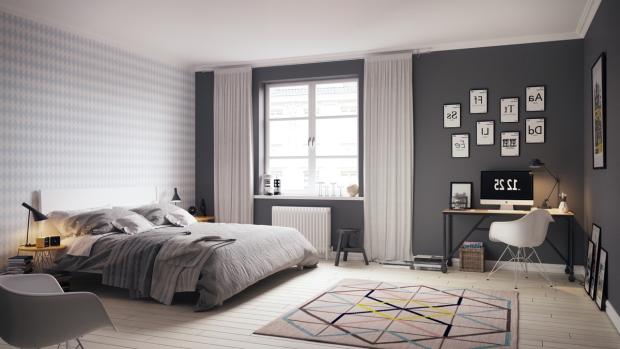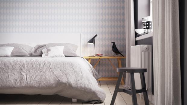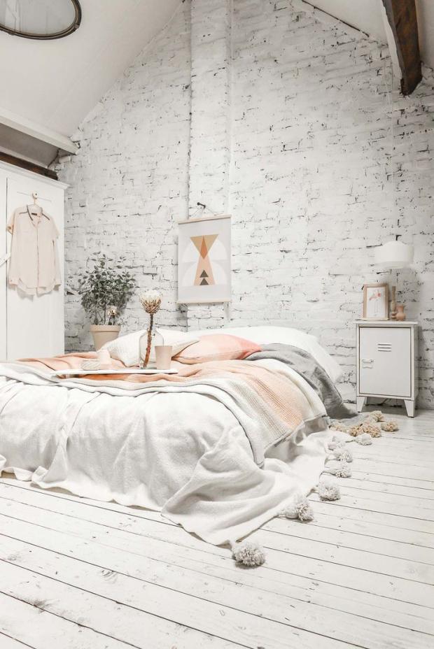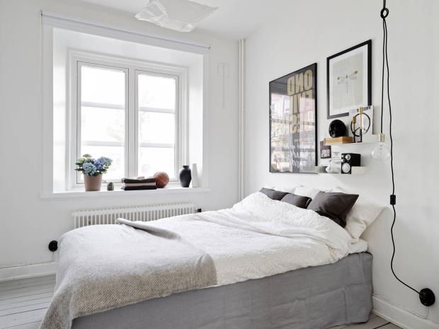 Скандинавский стиль в интерьере спальни подчеркнет правильно подобранный текстиль – постелите на кровать хлопковое покрывало кремового или слегка розоватого цвета. Кровать могут украшать декоративные подушки более ярких тонов.