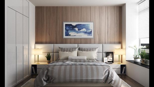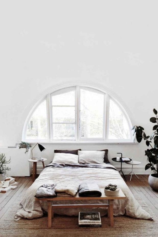 - Поставьте двуспальную постель прямоугольной формы с минимально низким изголовьем или без него.