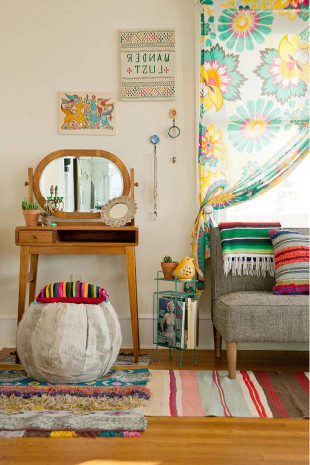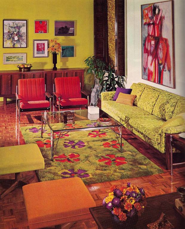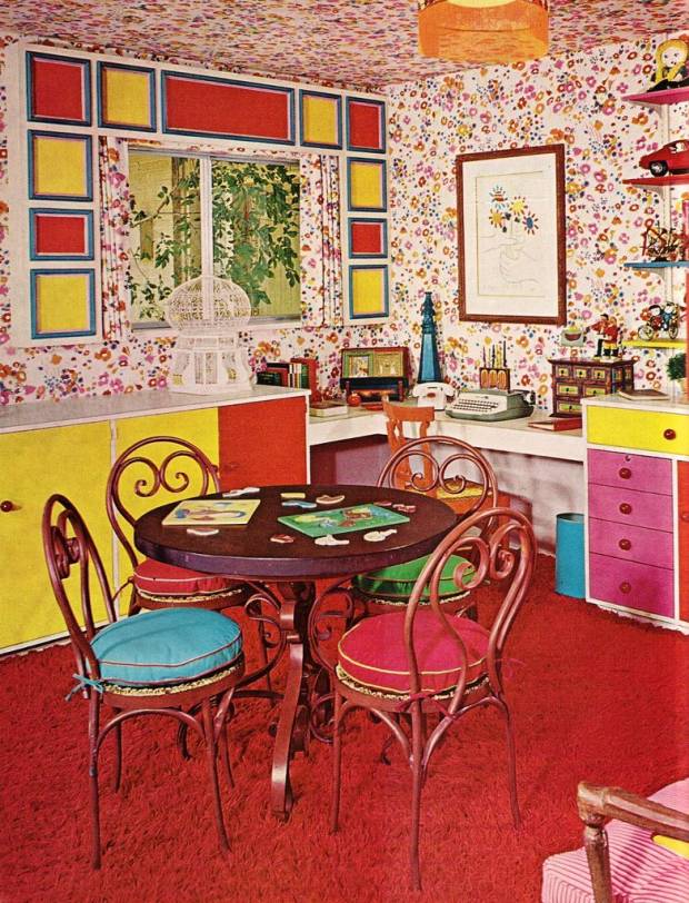 Рациональности в интерьерах домов в стиле ретро поубавилось. Обивка и отделочные материалы стали с цветочным принтом под влиянием субкультуры хиппи. Цветовая палитра стала более разнообразной. Начали применяться контрасты и смелые цветовые сочетания.