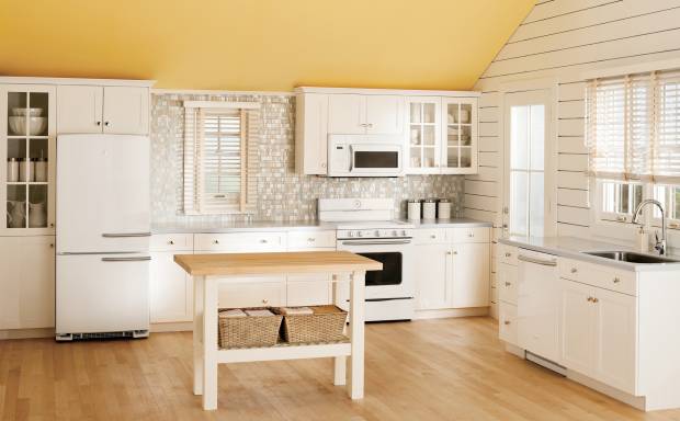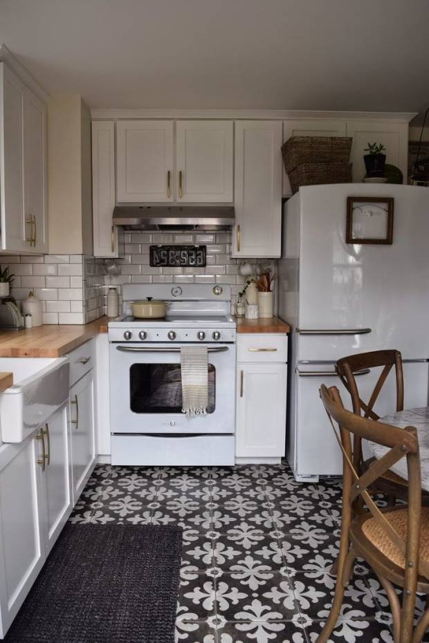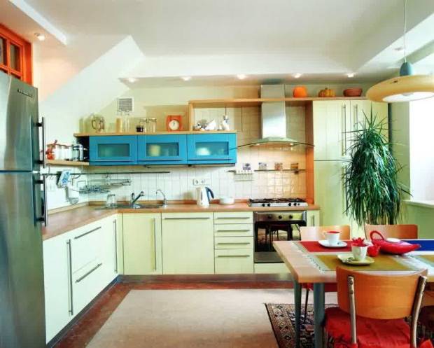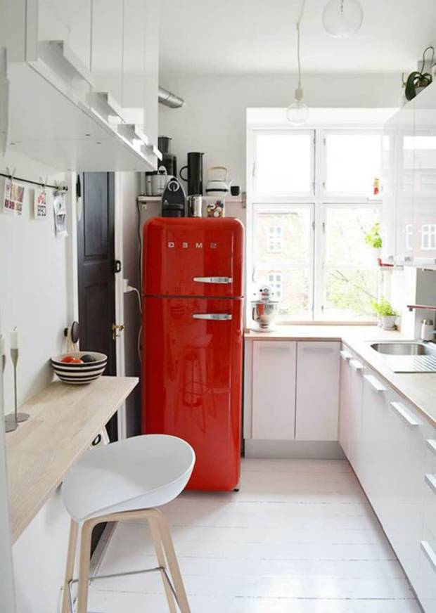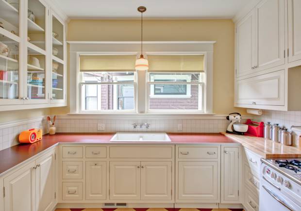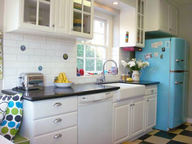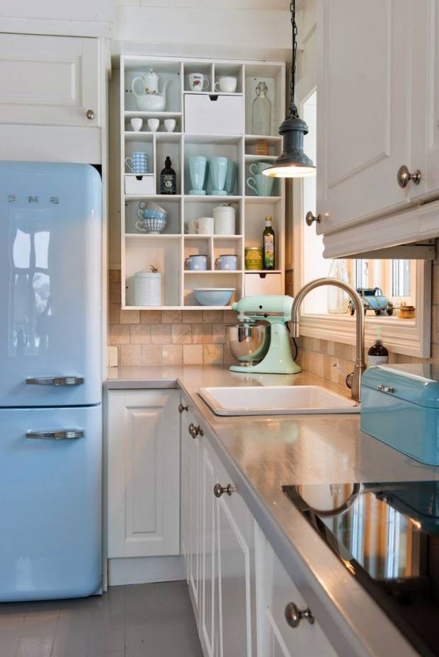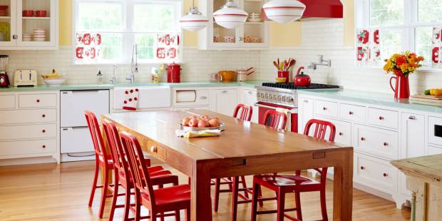 Интерьер кухни ретро эффектно подчеркнет сервант с фарфором и посудой в ретро стиле. Хорошим решением будет поставить отреставрированный холодильник того периода. Задействуйте текстиль – хлопковые или ситцевые скатерти в клетку, горошек или полоску.