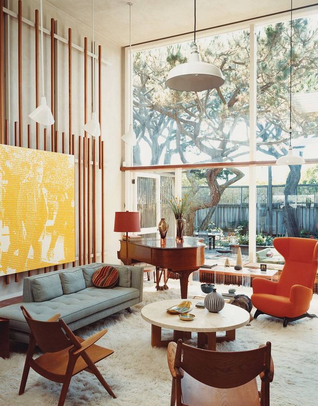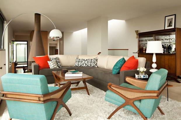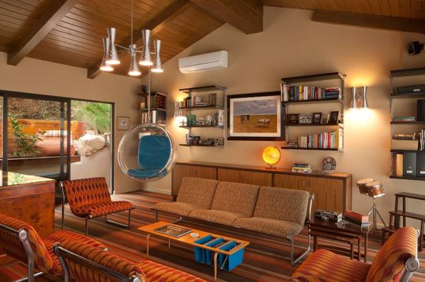 Ретро мебель в интерьере 60-х практически не изменилась, но наряду с ней дизайнеры начали изготавливать предметы интерьера нестандартных форм, например, обтекаемых или на довольно тонких и высоких ножках.