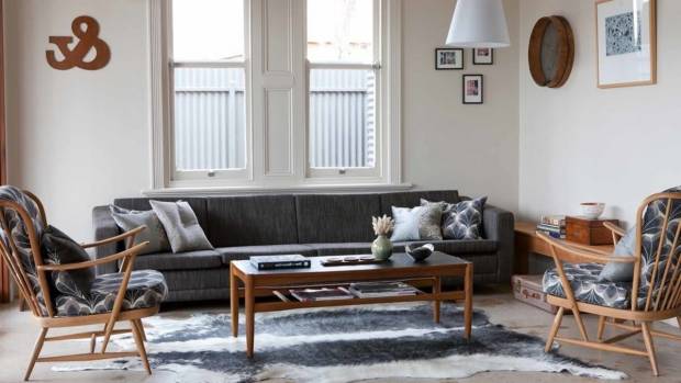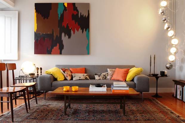 В интерьере гостиной ретро есть перечень характерных предметов: невысокая стенка на ножках, в одной части которой стоит хрусталь, а в другой – книжная библиотека, диван правильной формы (часто с прямоугольными подушками), для телевизора тумба на высоких ножках, торшер. Одну из стен дополняет ковер с геометрическими фигурами.