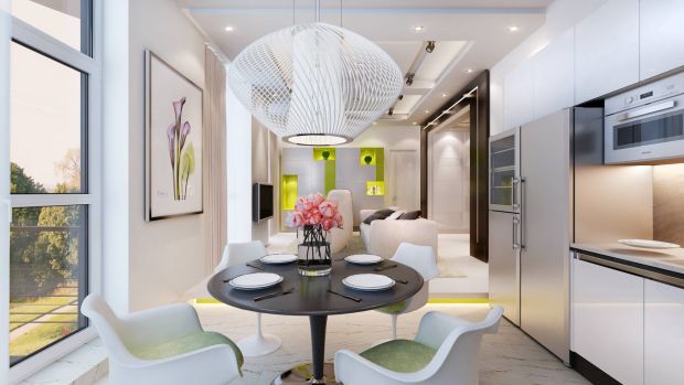 Будь это дизайн кухни-столовой в частных домах или совмещение с зоной отдыха, интерьер становится комфортным, если сохранить функциональное зонирование и подчеркнуть целостность декоративных приемов.