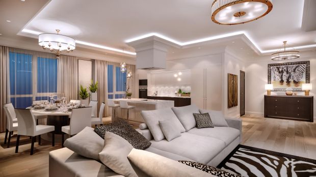 При достаточной площади столовую объединяют не только с кухней, но и с гостиной.